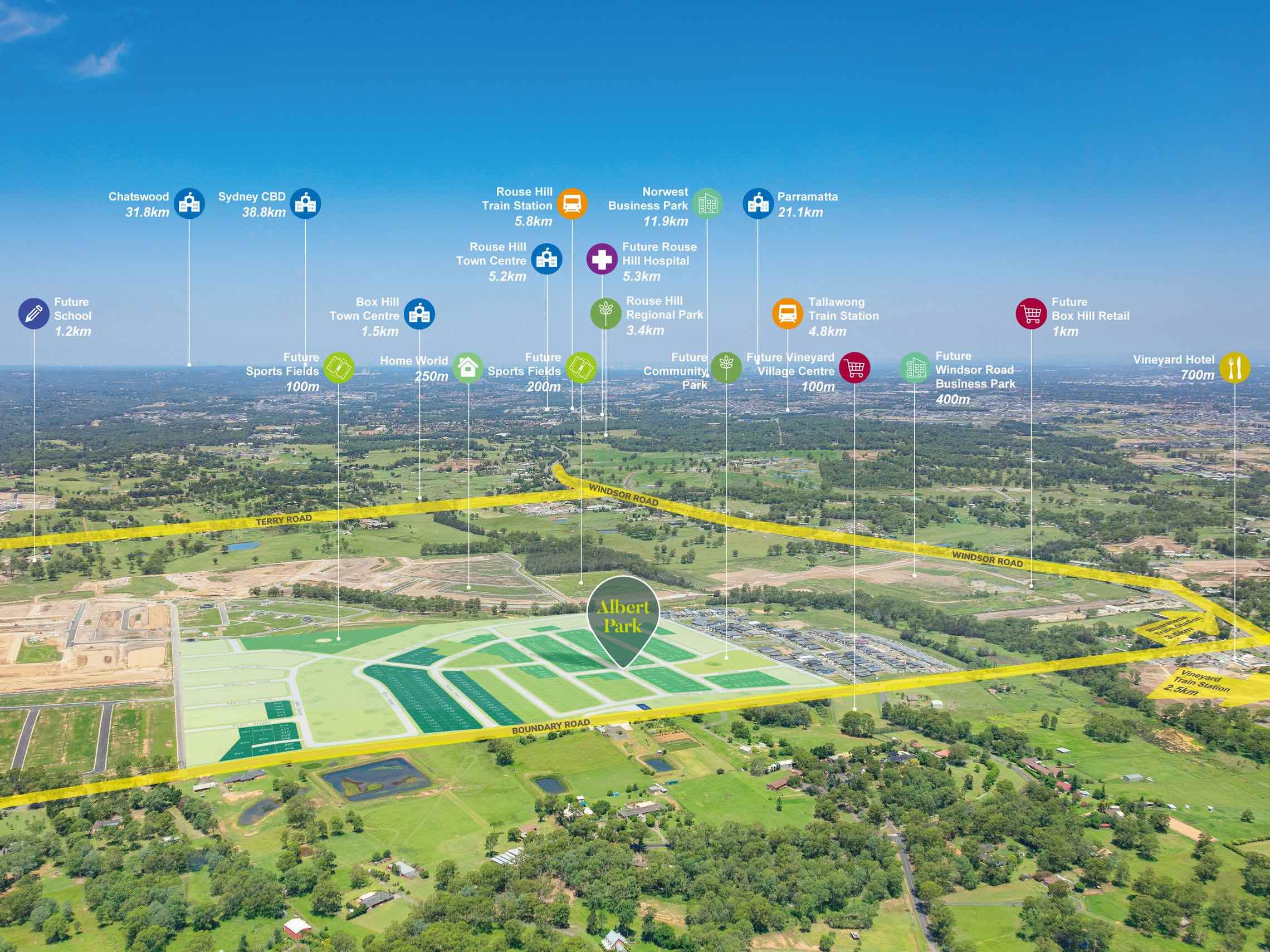 “Direct connections to nearby regional transport hubs, including the Rouse Hill, Riverstone, Area 20 and Schofields Road Transit Boulevard ensure regional public transport accessibility”.