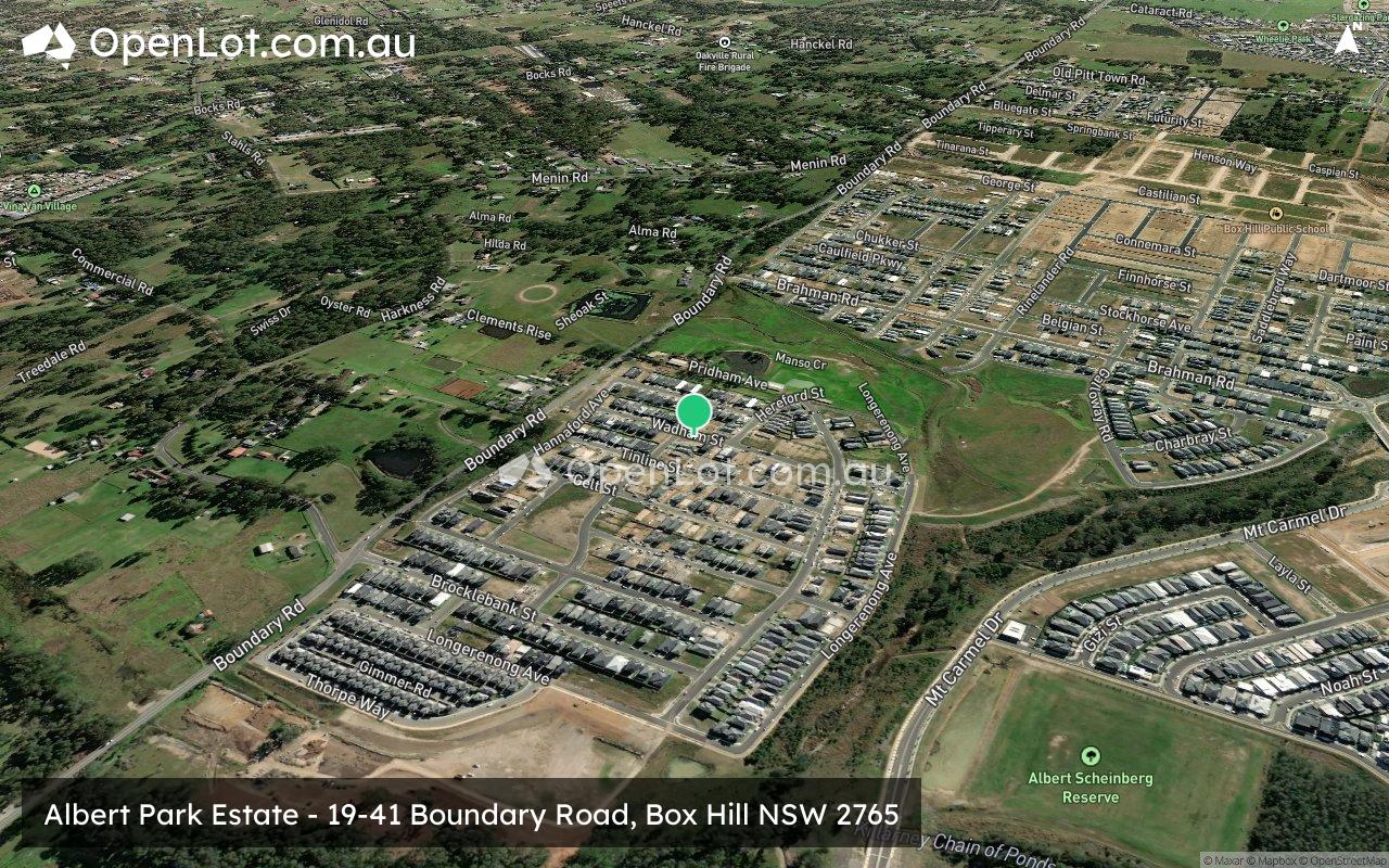 The suburb boundary is located along Boundary Road to the west and Annangrove Road to the east. The suburb boundaries are along Old Pitt Town Road to the north and Windsor Road to the south. Terry Road, Mount Carmel Drive and Nelson Road run through Box Hill, providing access to the surrounding suburbs and the local network of roads. Killarney Chain of Ponds continues from the adjoining suburb of Vineyard and splits into other smaller creek corridors connected by a series of water holes.