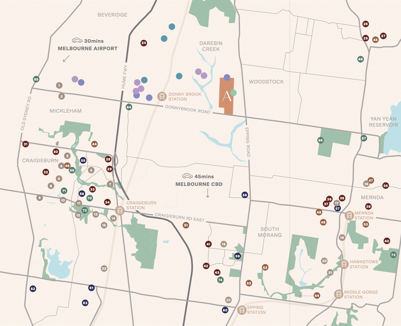 | Distance to | Melbourne Airport - 22 km north-east Melbourne CBD - 31 km north |