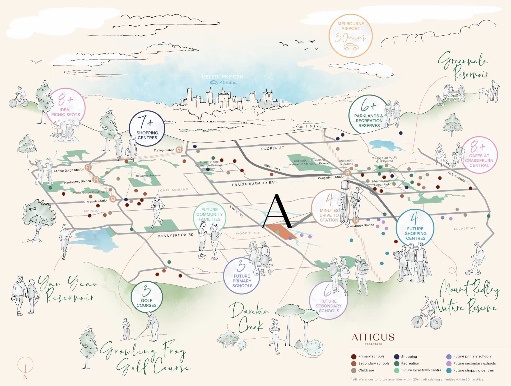 The suburb will include a network of shared paths linking the local parks and a new road network. Donnybrook Road and a new future state arterial road will provide access to the Hume Freeway, providing a direct connection to Melbourne CBD or northern Victoria.