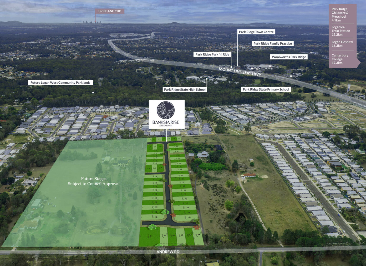 The surrounding precincts will provide further social, educational, retail and community infrastructure for the new community, such as North Maclean, Bromelton and Park Ridge. Local shopping, services and further employment will be found within the Greenbank Shopping Centre and new local centre.