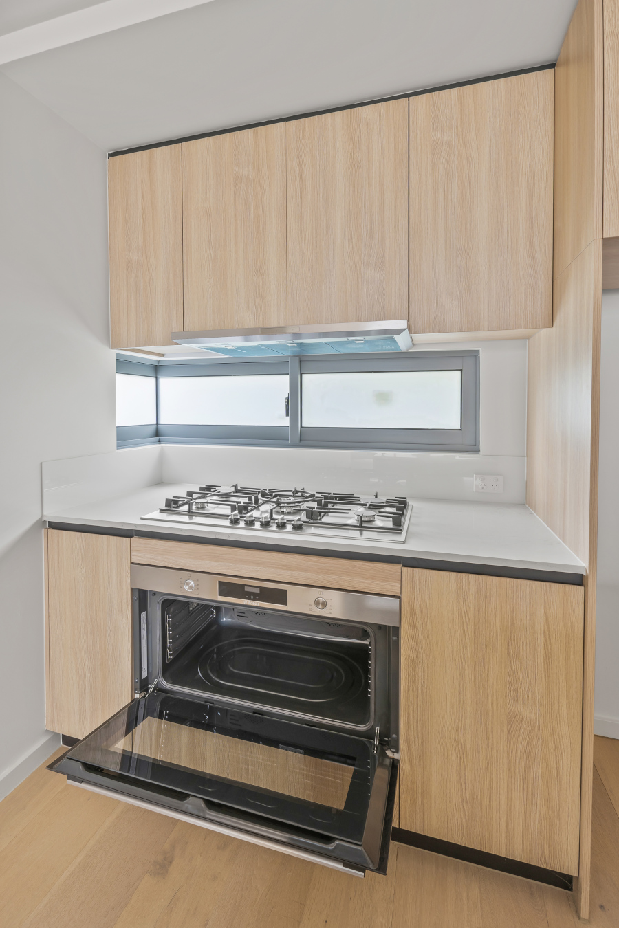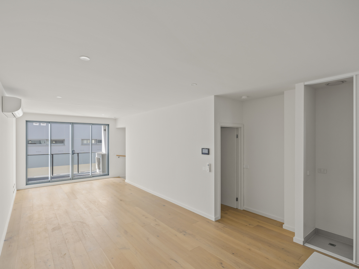 - Modern sleek lines and timber flooring in the living room