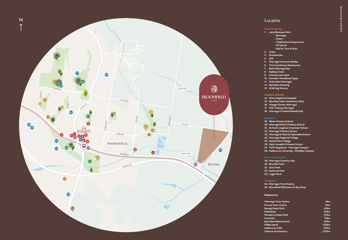 - Less then 5 minutes to Warragul Town Centre, with Nilma Primary School right across the road, Princes Freeway 2 minutes away, and positioned at the gateway to the Gippsland Wine Region.