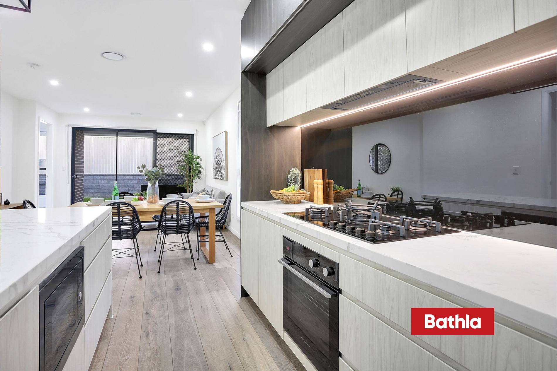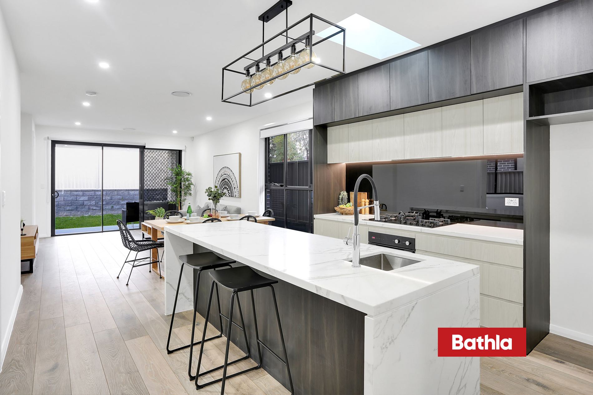 * Open plan living consisting of kitchen and dining area integrating with outdoor living