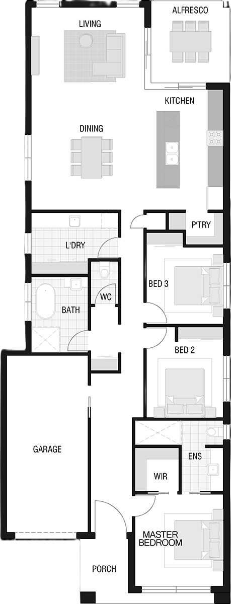 The Arlo is a single storey designed home suitable for blocks 10m wide. The Arlo has been expertly designed to get the most out of small blocks. Boasting spacious 3 bedrooms, 2 bathrooms and 1 garage. The Arlo has a full sized kitchen and entertainment area allowing even the smallest block all of the requirements to be an entertainers dream.