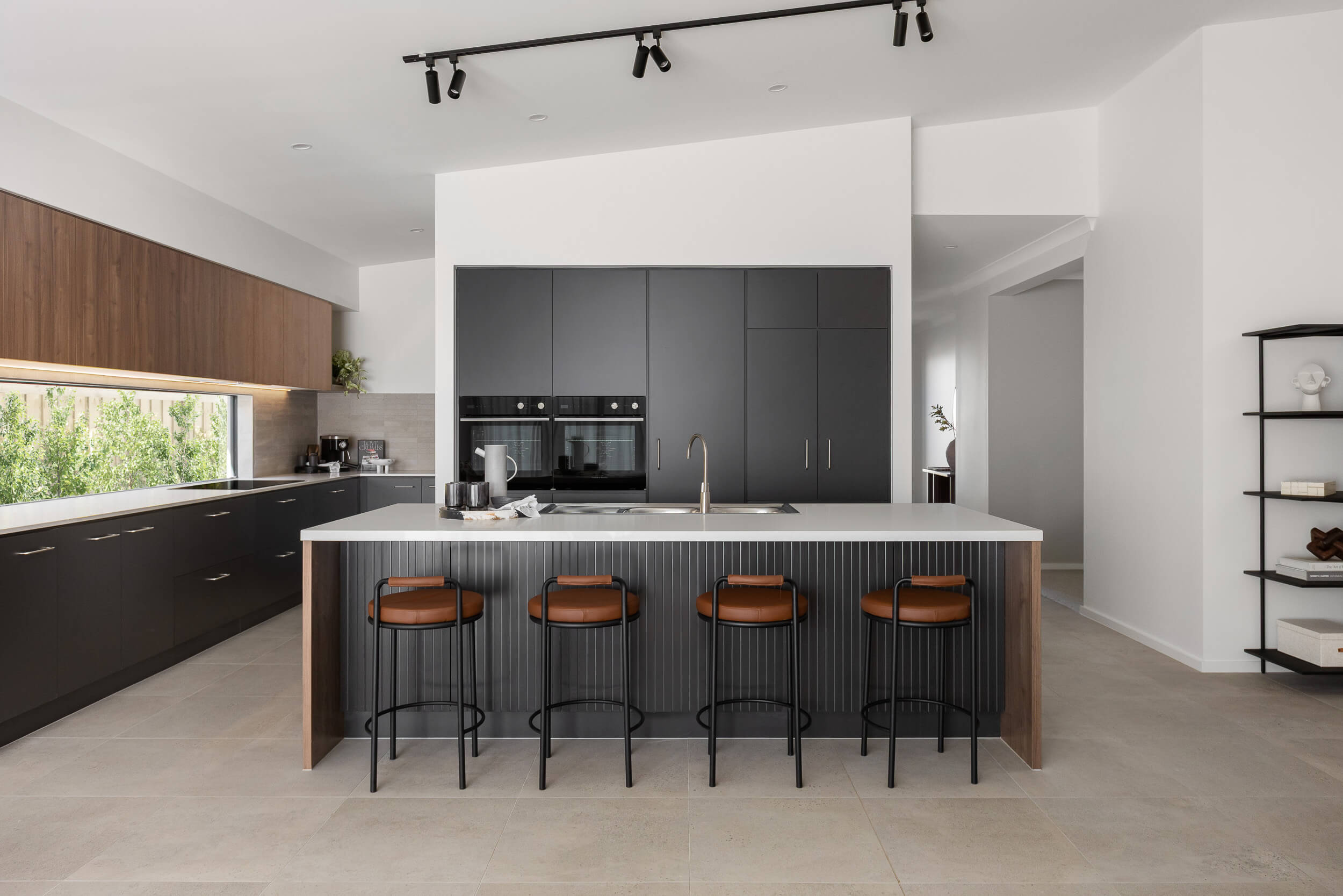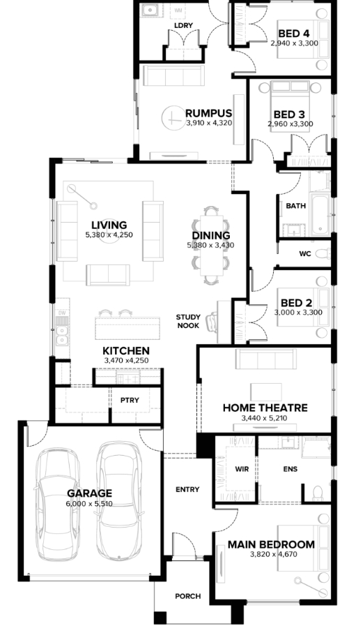 At its core is a spacious family living area that comprises a kitchen and dining area, a sectioned off family zone, a study and a home theatre. The master bedroom sits to the front of the house with three other bedrooms located at the rear. A rumpus is sited close by to provide a secluded kids’ zone.