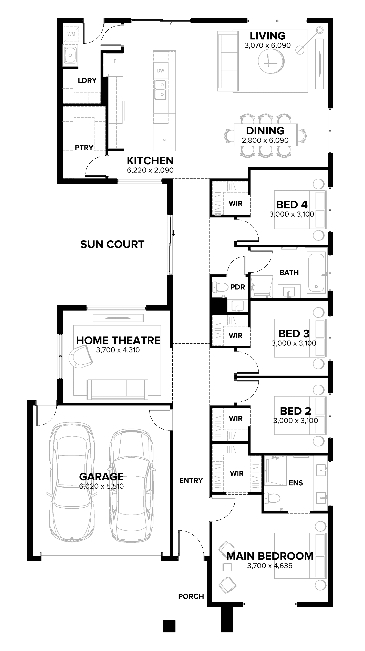 The appeal of the four bedroom Milan is obvious at first glance but you soon realise that elegance also lies in the detail. The living area opens out to a generous sun court, which doubles as an additional outdoor lounge area. It’s the ideal setting for a coffee in the sun or dessert on a summer night. Once the evening begins to cool, you can shuffle inside to join the kids in the snug home theatre. Unwind, play or party as the moment dictates. Life will never be the same again in this strikingly modern home that utilises every centimetre of space for style and luxury.