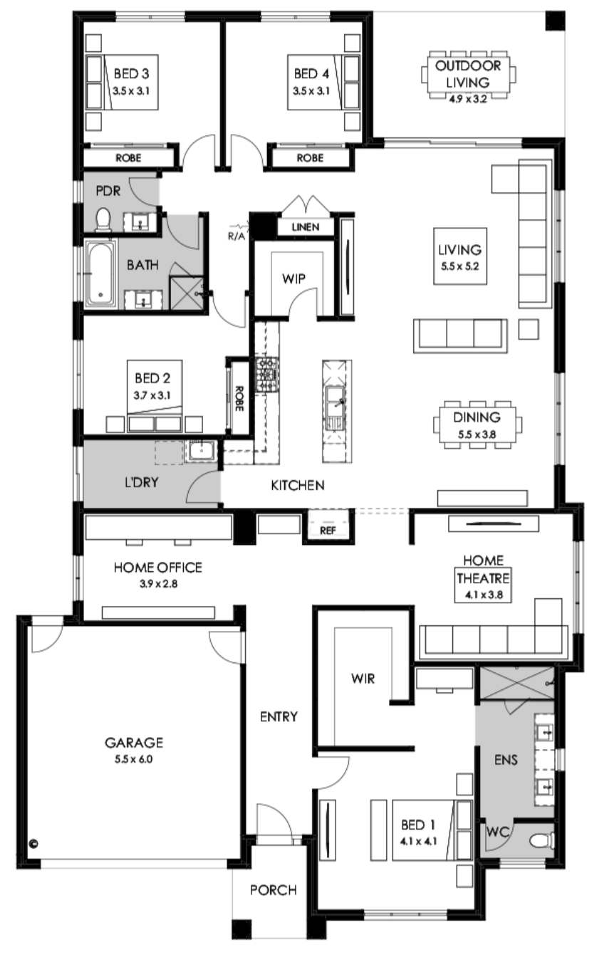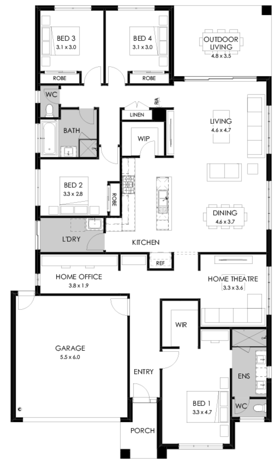 Positioned near the entrance, the master bedroom promises a tranquil retreat separated from the rest of the home. The clever use of space allows for a spacious walk-in robe, and an ensuite with double vanity, large shower and separate WC.