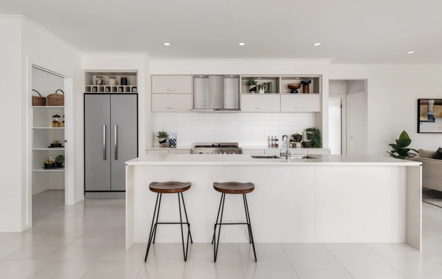 Gourmet kitchen with island bench and walk-in pantry overlooking the main living zone