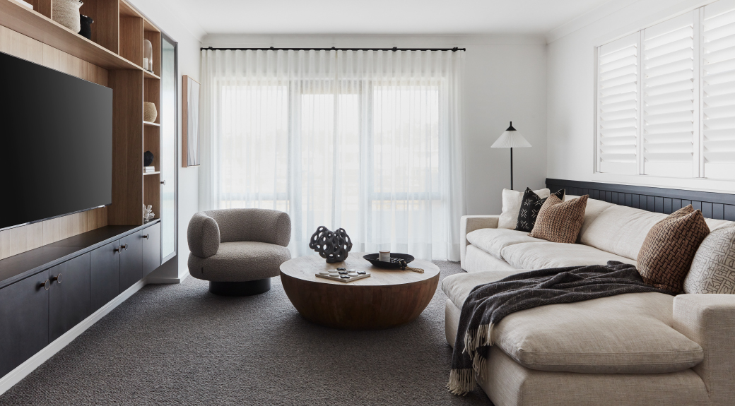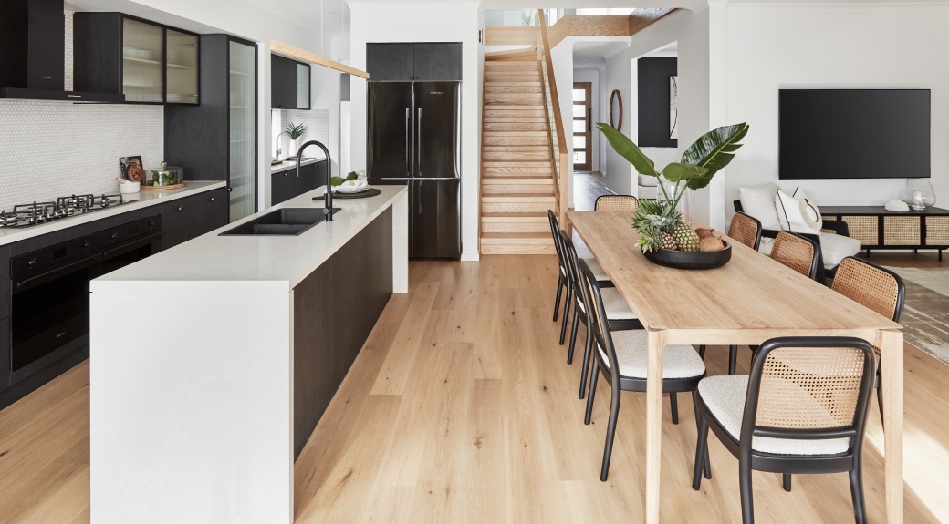 The two-storey display home has an elegantly modern Gallery façade, the crisp white render matched with a Monument Colorbond roof and Bodega stone-clad pier. Setting the scene for the stylish natural palette of the home’s interior, the light hues of the stone are repeated in the front porch’s blonde oak front door and paving. Above the porch is the first-floor balcony, which is accessed via the Leisure room and adds volume and airiness to the exterior.