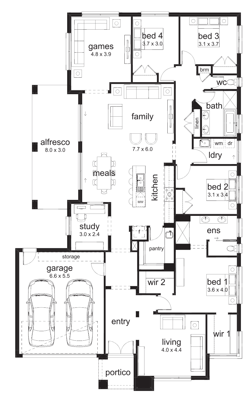 The Macedon is a real winner for families that love to entertain. Parents, kids and guests will also love having multiple separate living rooms, as well as a large alfresco dining space outside to continue the festivities. There’s plenty of storage space in the four bedrooms, but you can choose to add a fifth to suit your family’s needs. Plus, there’s a study that’s perfect for finishing schoolwork or working from home.
