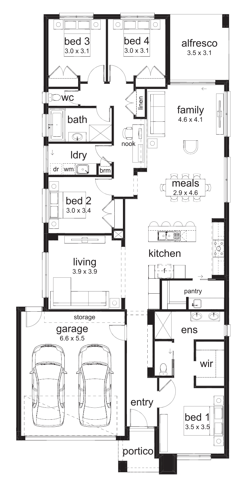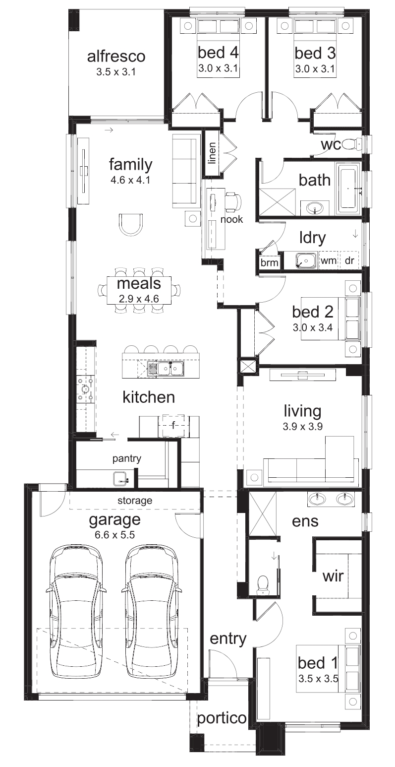 The Olinda is one of our homes that is well-suited to fit a narrow block. With a master bedroom at the front of the home, a study nook, three bedrooms and entertaining areas at the back, it’s perfect for a busy household in need of some space. This design also comes with the capability to flip the floorplan, so you can really tailor it to suit the orientation of your block or wider corner blocks of land.