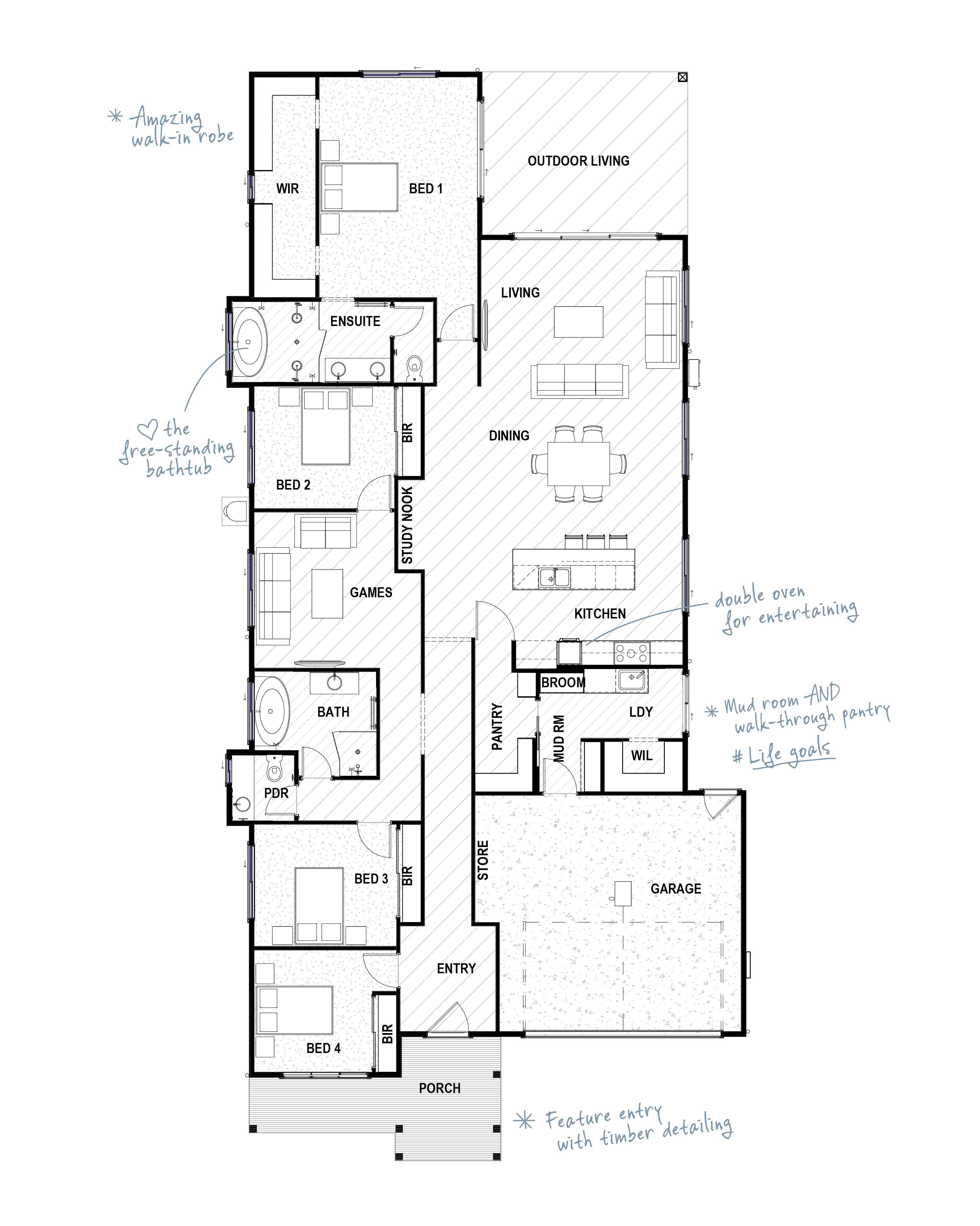 Capturing effortless modern coastal style, this spacious home inspires relaxed, cruisy living at every turn. Cleverly incorporating a mud room, walk-through pantry, and bags of storage, the Whitehaven is designed to deliver the calm in the chaos of day-to-day family life.