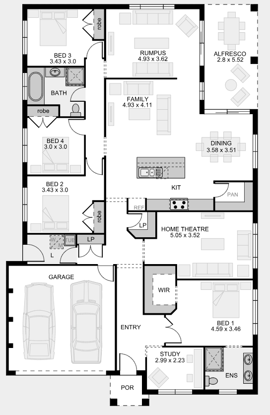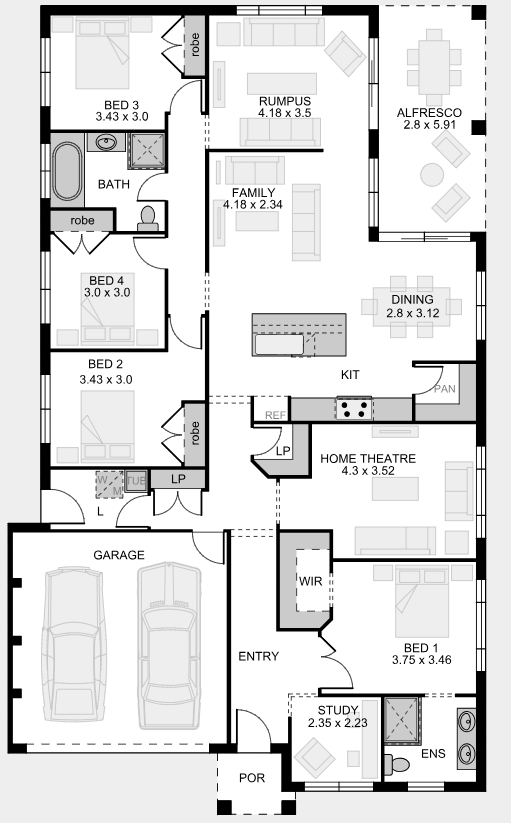 The ample space of the Kew acts as an oasis away from the hustle and bustle of modern life. Families will appreciate relaxing in the generous living spaces and deliberately separate private areas that this well-considered layout provides. It even features a home theatre where everyone can get together and enjoy a great night in. The Kew is home design at its best.