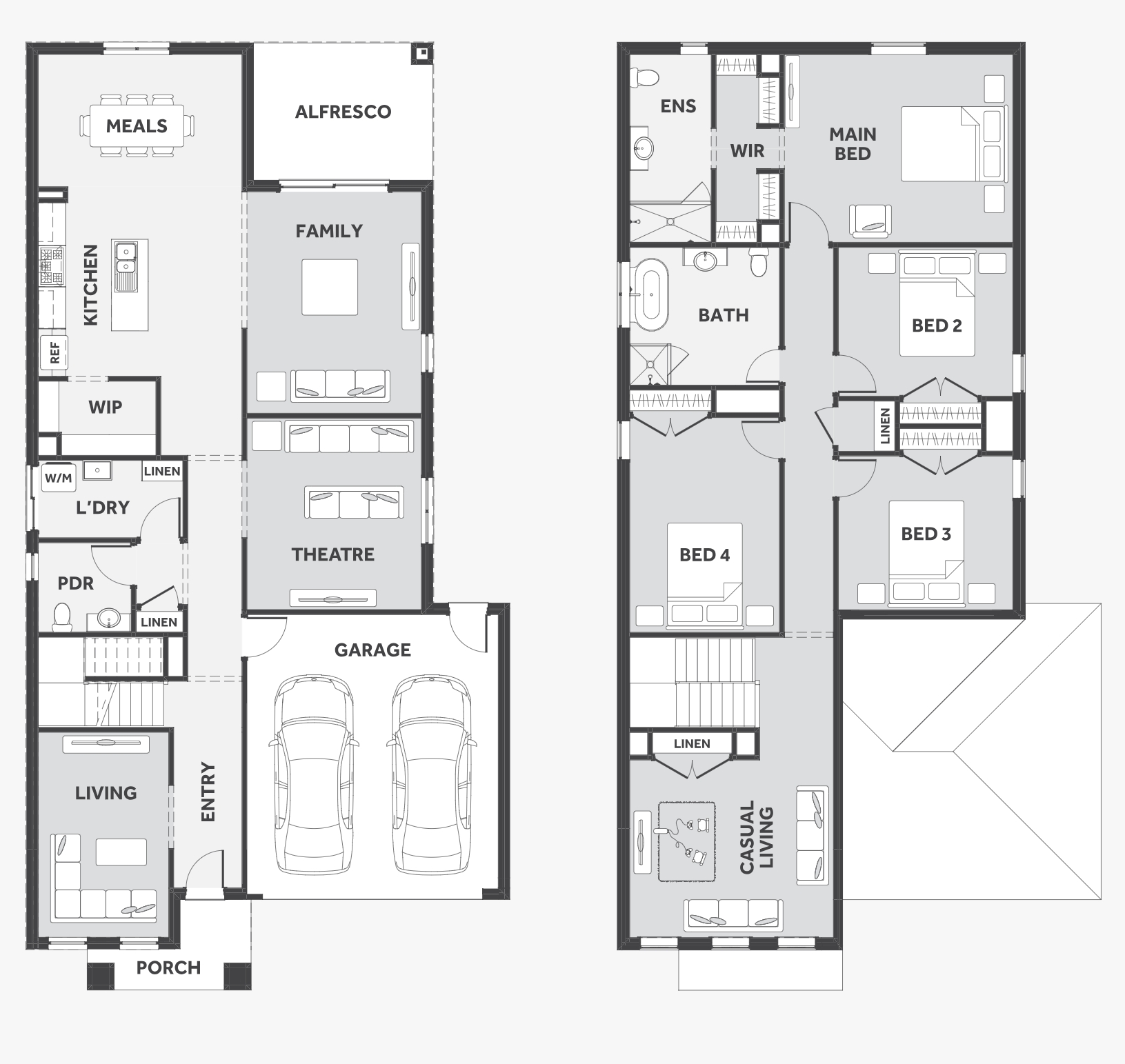 The d TWO range embraces functionality and space with an uncomplicated design. The central kitchen overlooks the meals and family areas, which extend into the alfresco. Its generous four bedrooms includes a vast master suite with an expansive walk-in robe and an adjoining ensuite. The first-floor casual living area creates a perfect retreat for kids, while the lounge adjacent to the entry creates a warm welcome.