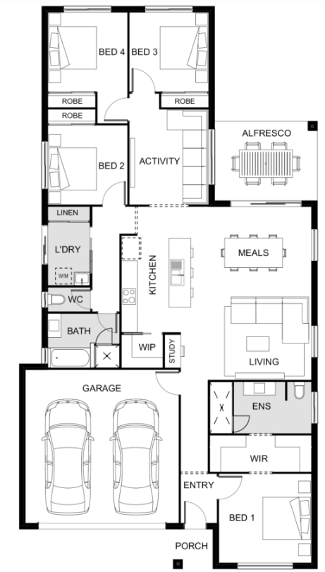 As soon as you walk in the front door and take in the Cove 202, you’ll know this is the house you’ve had your heart set on calling home. Featuring a walk-through robe and beautiful ensuite, the private and spacious master bedroom in this 4-bedroom, single-storey house plan is located at the front of the home away from the remaining bedrooms and is perfect for relaxing at the end of the day. This stylish and flexible Luma home design features a gourmet kitchen with island bench, walk-in pantry and a handy study nook, which adjoins the open plan living/dining area that leads to the alfresco.