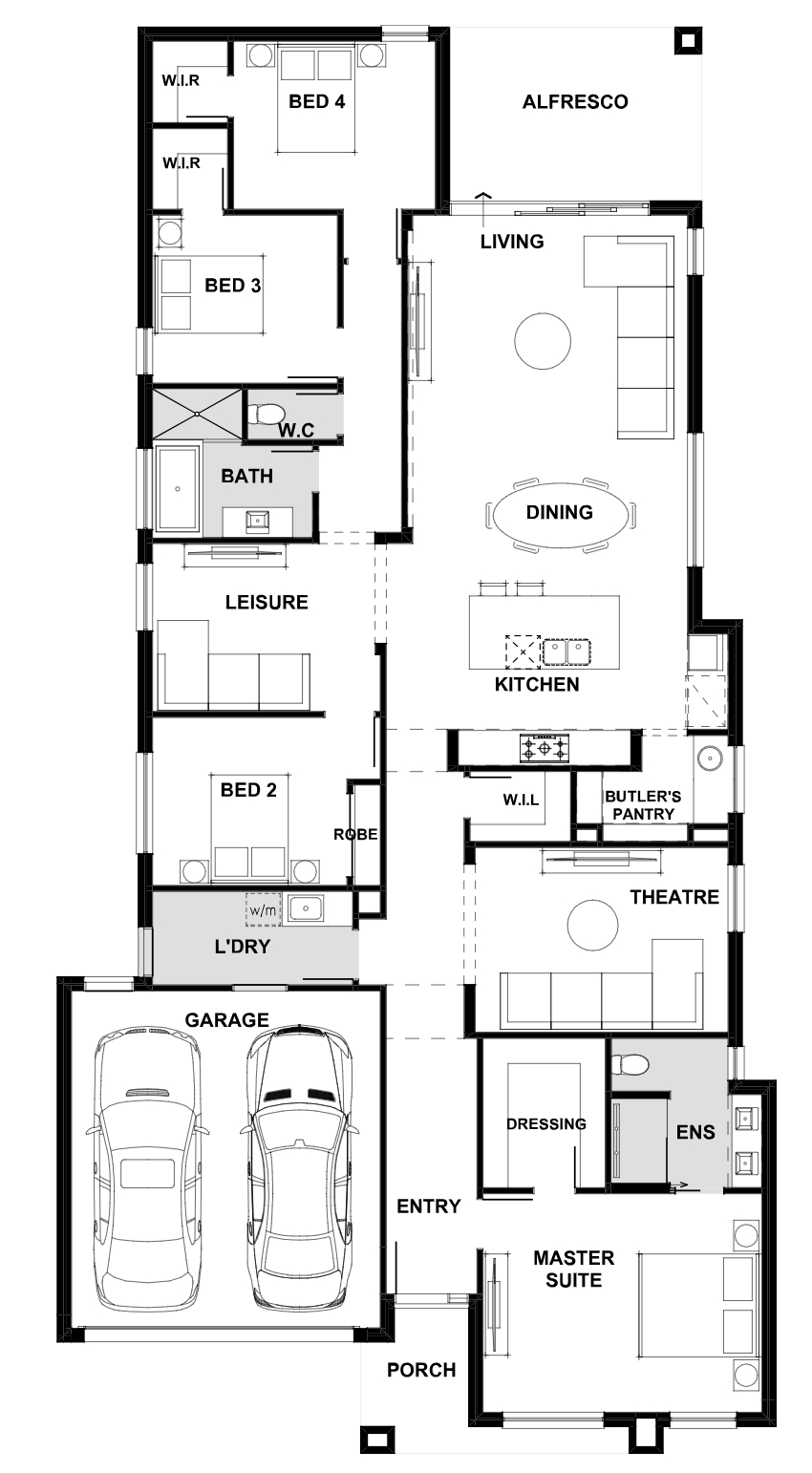 The kitchen sits at the head of room overlooking the living and dining zone that opens up into the alfresco area. Tucked away to the side of the home is the secondary sleeping zone including its own private leisure area