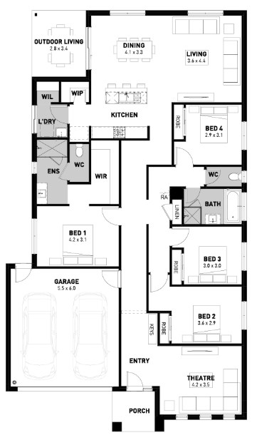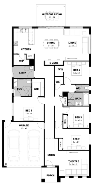 Specifically designed to maximise the view of the backyard from the open-plan kitchen and living areas, the Kingston is perfect for any growing family. The area is also complete with an e-zone so you have the perfect work space rather than needing an entire study.