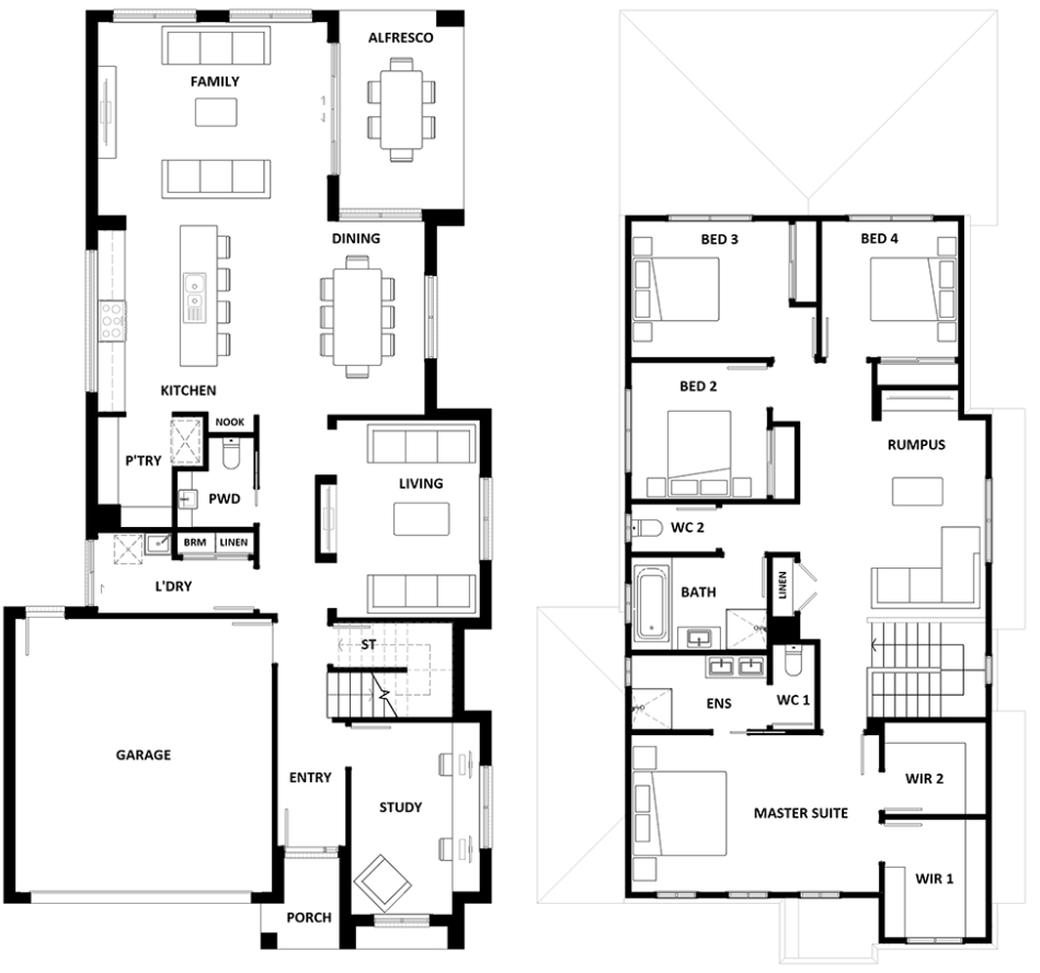 Named after the Victorian coastal town, the Lorne 297 is a perfect home suitable for most narrow blocks of land. The classic double storey design utilises the ground level for everyday living featuring a large corner kitchen, open-plan family and meals area, an alfresco, private living room, plus a study. The second storey features four spacious bedrooms and a kid’s zone. The spacious master bedroom is the ideal parent’s retreat, featuring a large walk-in robe and ensuite. Complete with a double car garage, this home is practical and stylish.