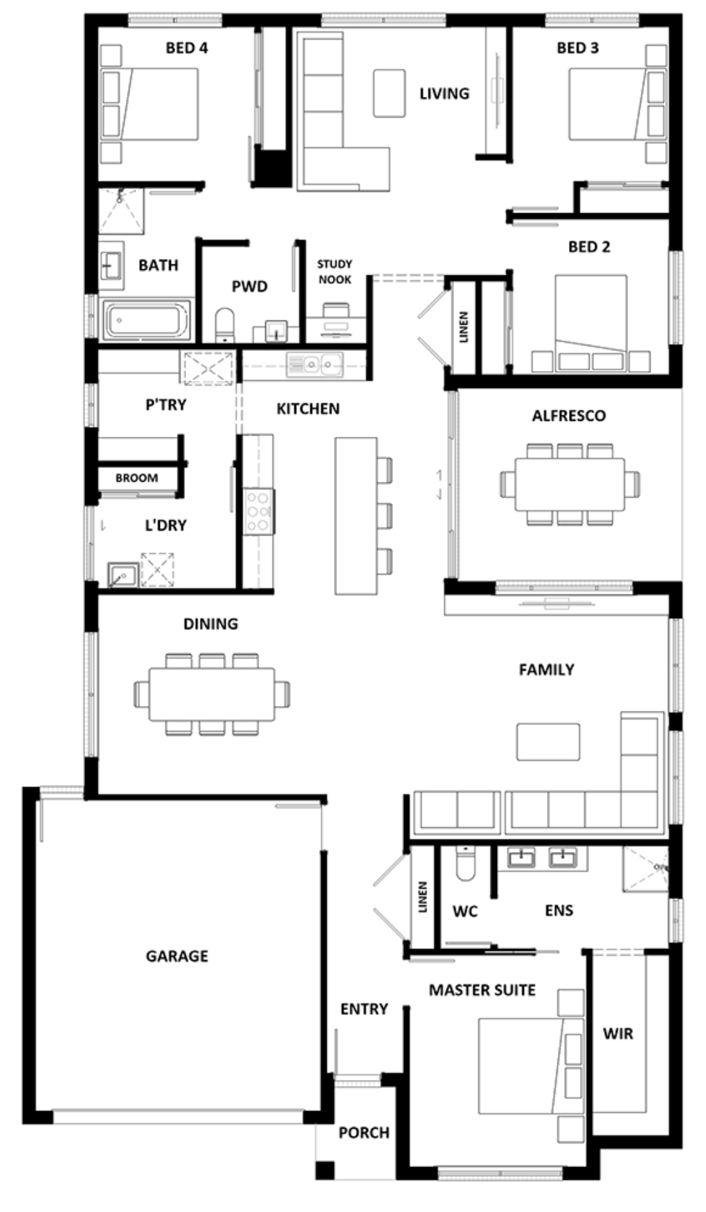 The Luca boasts four large bedrooms and two separate living areas. A stunning parents’ paradise, you will find the master suite at the front of the home. It features a large walk-in robe, plus an ensuite with double basins. The heart of the home is an entertainer’s haven, complete with a huge kitchen with island bench, plus a family and dining area. It also includes a spacious walk-in pantry and laundry, as well as easy to access alfresco. The rear of the home was designed for the kids, featuring three additional bedrooms, all with built-in robes, which wrap around a central living room. This area also houses a family bathroom and a conveniently located study nook. The Luca could be the ultimate home for you and your family.