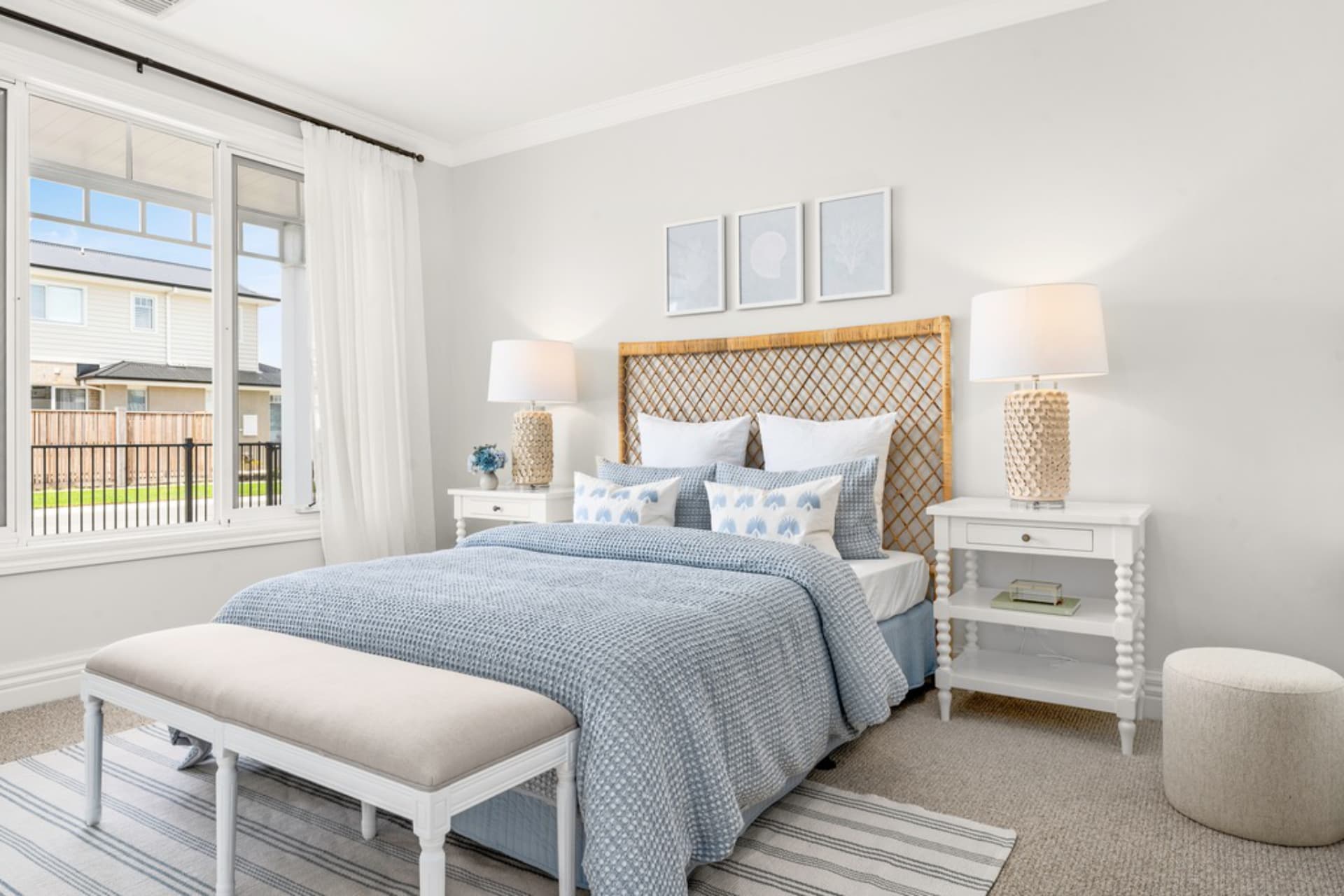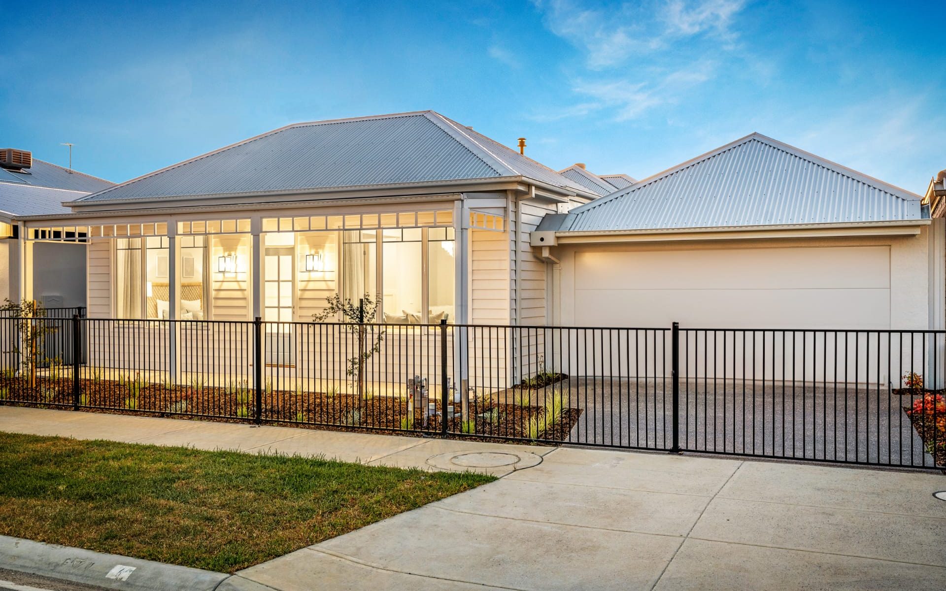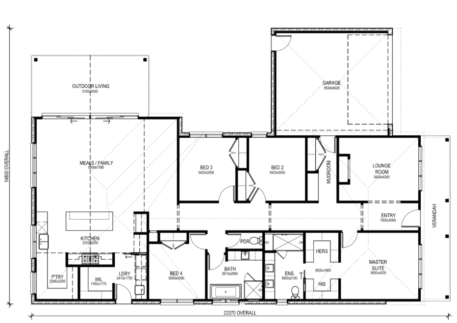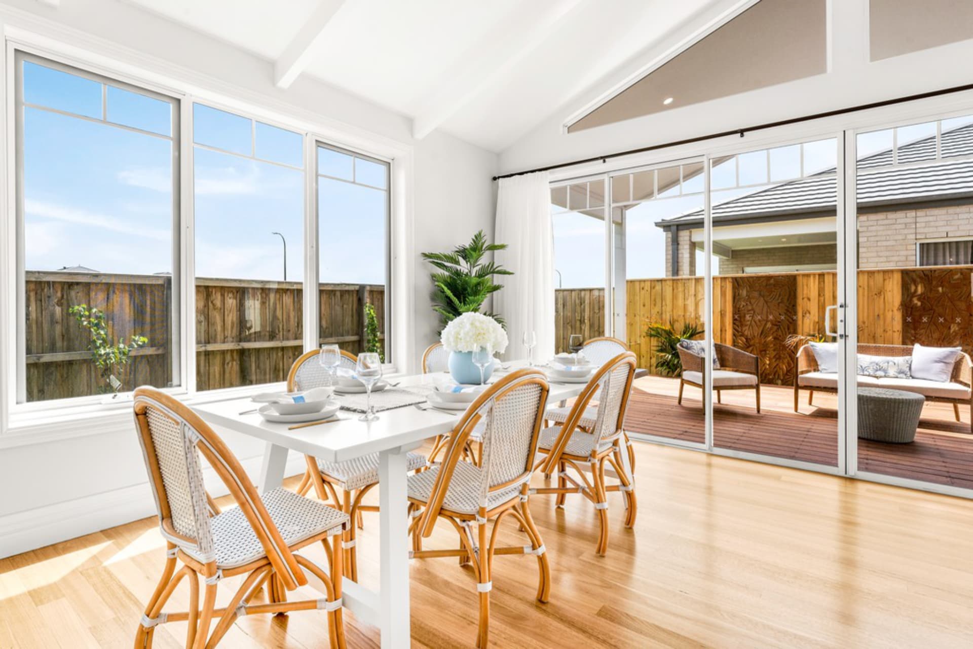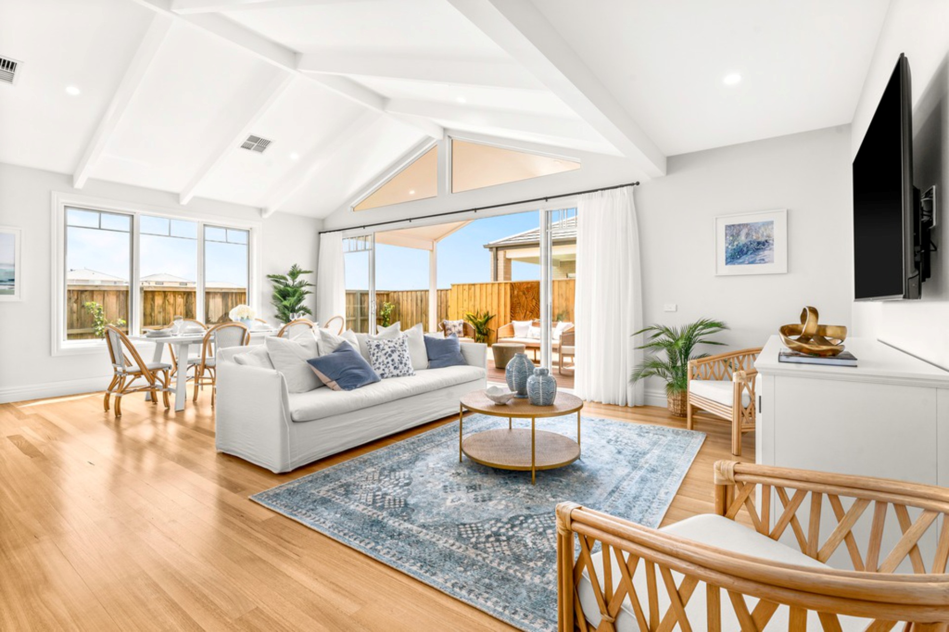 The Alabama boasts stunning coastal Hamptons styling, combining yesteryear charm with modern beachside living. It features a cozy lounge/office, a spacious Master Bedroom with walk-through robes and a beautifully designed ensuite. The Family, Kitchen, and Meals areas have vaulted ceilings with exposed beams, leading to an elegant Outdoor entertaining space with triangle windows above bi-parting doors.