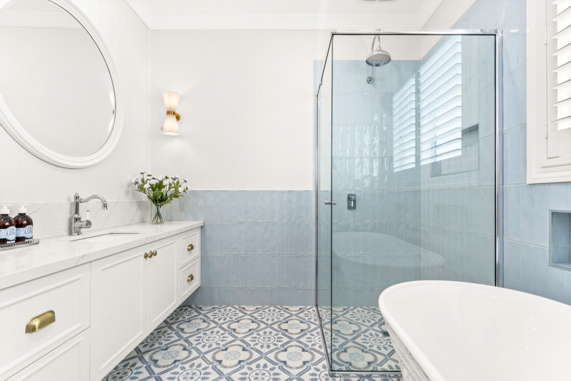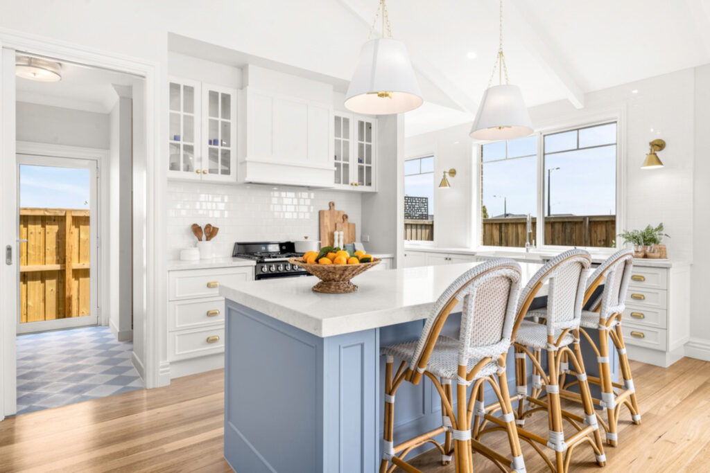 The classic Hamptons style two-tone Kitchen offers a glass overhead, coffee station, and a spacious Island bench with a farmhouse sink below the window. Additionally, there’s a walk-in pantry and laundry on either side and behind the kitchen, ideal for a busy family.