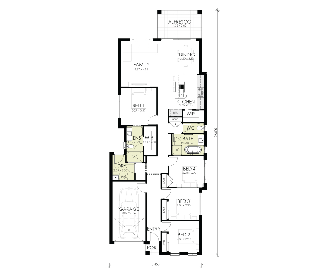 Spacious Bedrooms: This design features four generous bedrooms, ensuring ample space for the entire family. The main bedroom includes a luxurious ensuite and a walk-in robe, offering a private retreat for parents. Bedrooms 2, 3, and 4 are well-sized and include built-in robes for convenient storage.