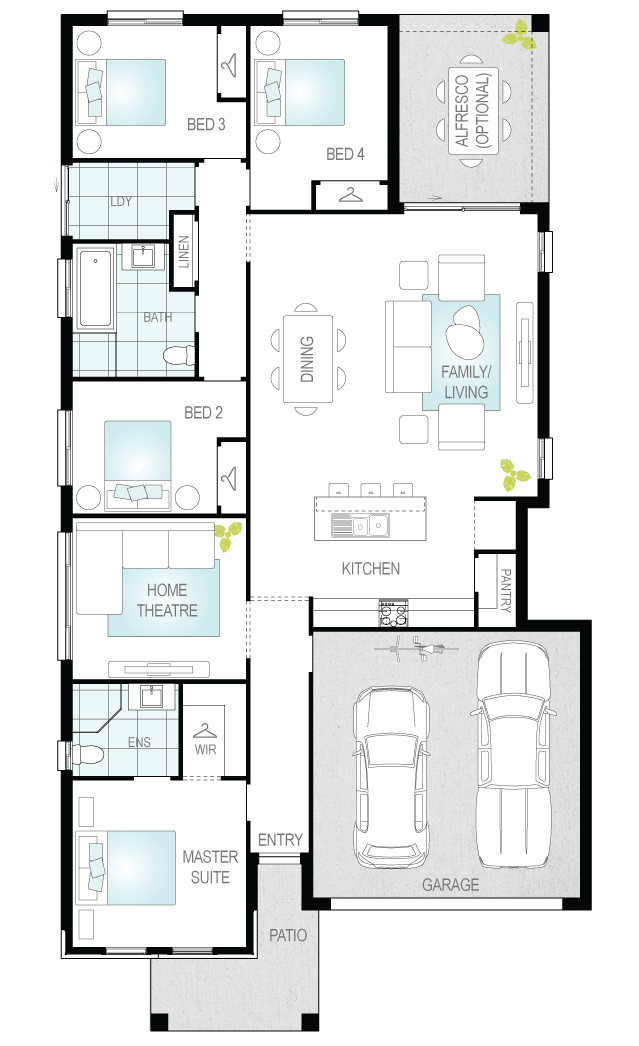 The heart of the home is the spacious living with a wonderful gourmet kitchen which looks out across the living/dining with views out to the optional alfresco. The impressive kitchen has an impressive island bench, enviable storage and the option to select a design variation with a walk-in pantry or upgrade to a butler's pantry making busy mornings a breeze!