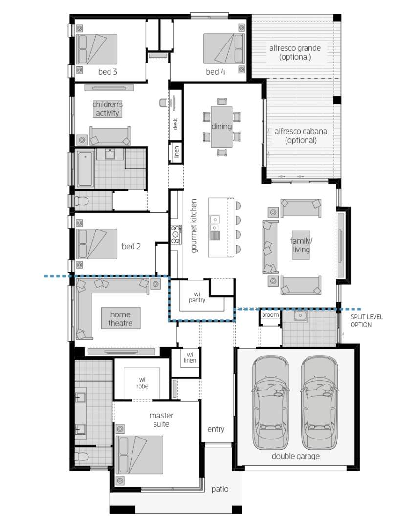 Hollywood proportions and thoughtful touches come together in the master suite to create a sanctuary away from the pulse of family life. The indulgent, oversized suite is home to a walk-in robe and ensuite, where his-and-hers-sinks make busy mornings and lazy evenings easy. What’s more, when you need time away from the kids, its proximity to the home theatre means quiet movie evenings for adults are a breeze.