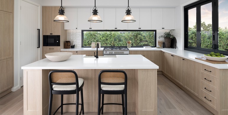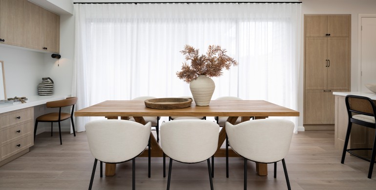 The heart of the home is the large kitchen overlooking the dining area and study nook, providing versatility for meals and work.