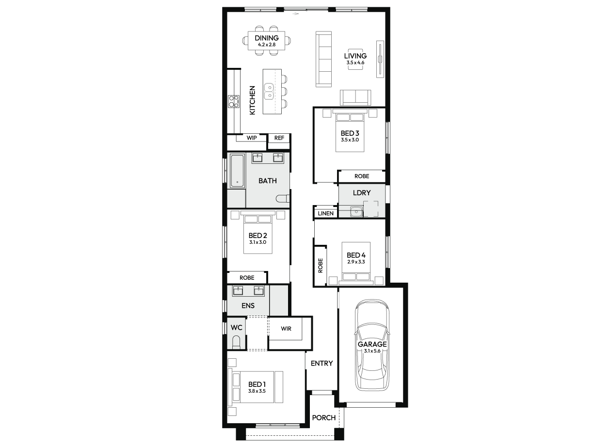 Located at the front of the home, the Master Suite boasts a generous walk-in Robe and Ensuite, followed by three Bedrooms and a sunlit, open plan Kitchen/Dining/Living that makes entertaining a breeze. Possibilities are endless in the Alpha 17, with the opportunity to include a comfortable Lounge in lieu of Bedroom 4, for that extra space for the family to relax in. This flexible home design is ready to make your own and begin making memories for years to come.