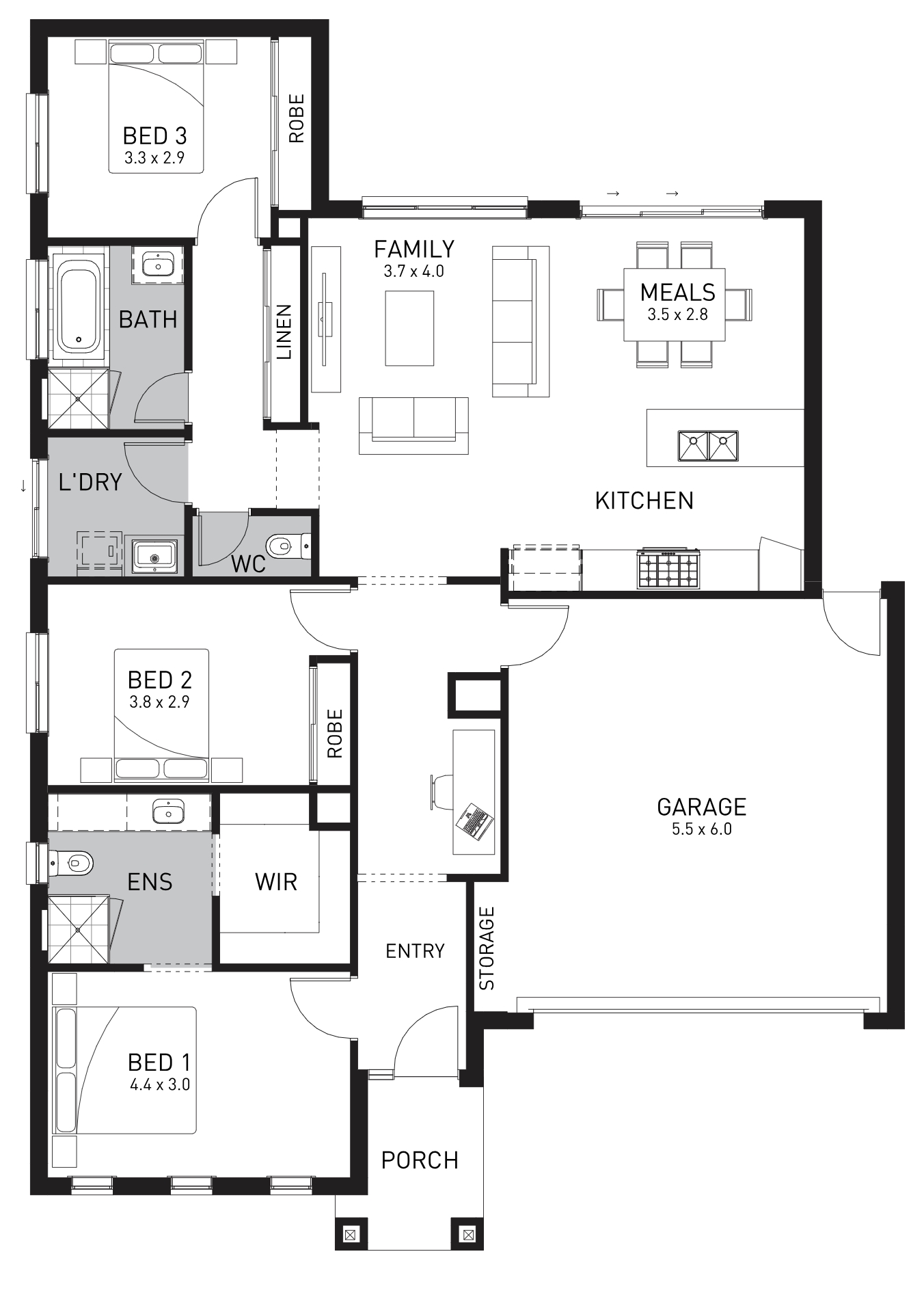 Comprising of three bedrooms, including master bedroom with ensuite and walk in robe, the Lenado also has a generous kitchen with large floating bench positioned beside an open plan family/ entertainment space and dining area, the ideal location to enjoy spending time with family and friends. There is also direct access to the backyard, and double windows with a sliding door ensure this space is flooded with light and fresh air. There is also ample storage space, a built in linen closet and a study niche hidden to the right of the entry way. This nook is ideal for children to concentrate on homework or can be made into a dedicated home office space. The Lenado is a design fit for the whole family and one of our most popular designs throughout Victoria.