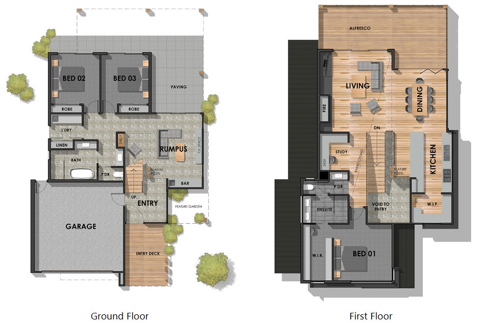 Being a corner block it was imperative we showcase an articulated façade featuring various contemporary ‘low maintenance’ external cladding materials. Opulence reigns when you step inside the cathedral inspired entrance. A central, open tread Blackbutt staircase with frameless glass balustrading separate the adult’s living area and bedroom upstairs from the kids bedrooms and rumpus/kids retreat downstairs.