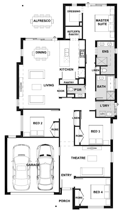 The Cascade is light, airy and offers an abundance of living space including a theatre cleverly tucked amongst the secondary bedrooms. A versatile study nook keeps technology out of the kids’ bedrooms or offers a perfect space for working from home.