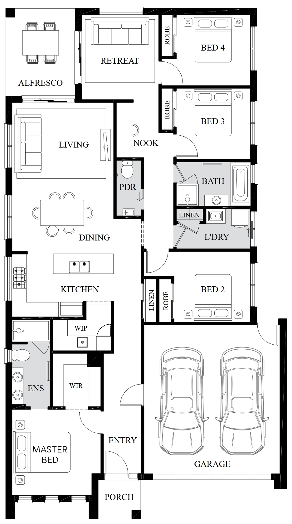 The Banksia elevates family living to the next level. It features four bedrooms, including a master bedroom with a separate ensuite bathroom and walk-in robe. The open living space of this home seamlessly connects to an outdoor alfresco area, offering plenty of space for the family to enjoy. The Banksia also features a private retreat area, providing the perfect place to relax and unwind.