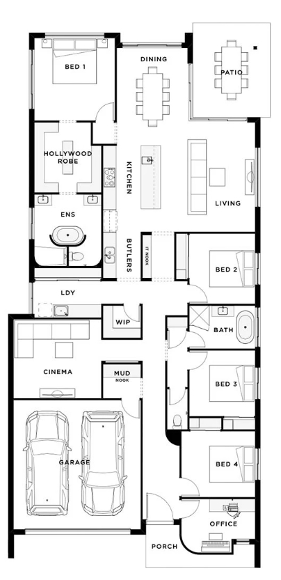 See why the Amara 27 is our most popular design. This four-bedroom, two bathroom home offers a family-friendly layout with two living areas, a good-sized laundry, a mud-nook and a seprate office. The master zone is nice surprise tucked away at the back of the house with a large bedroom, and an equally large WIR that leads into the impressive bathroom with his and her vanities. This is a plan that has it all.