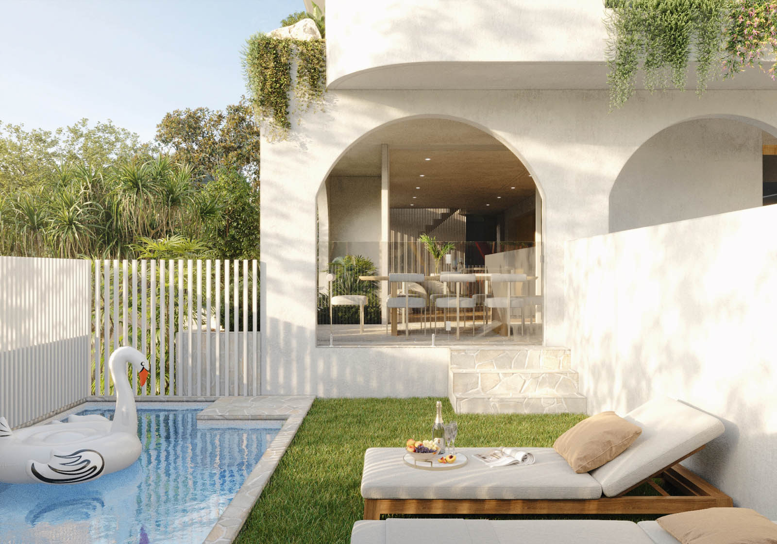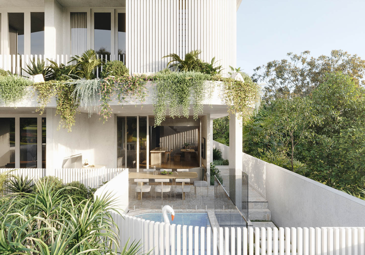 - The exterior of these villas features a striking façade, softened by lush greenery cascading from garden beds above, creating a welcoming atmosphere.