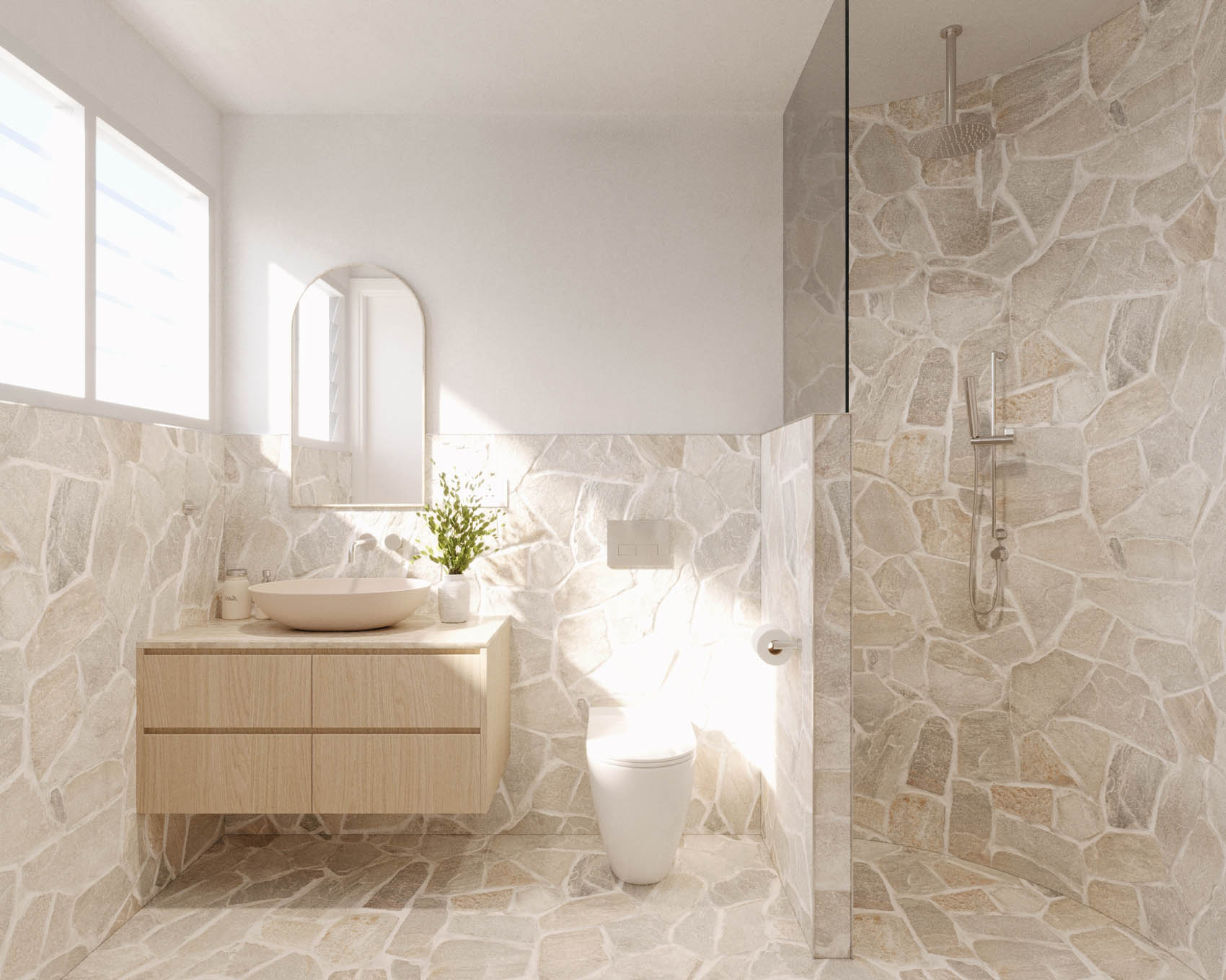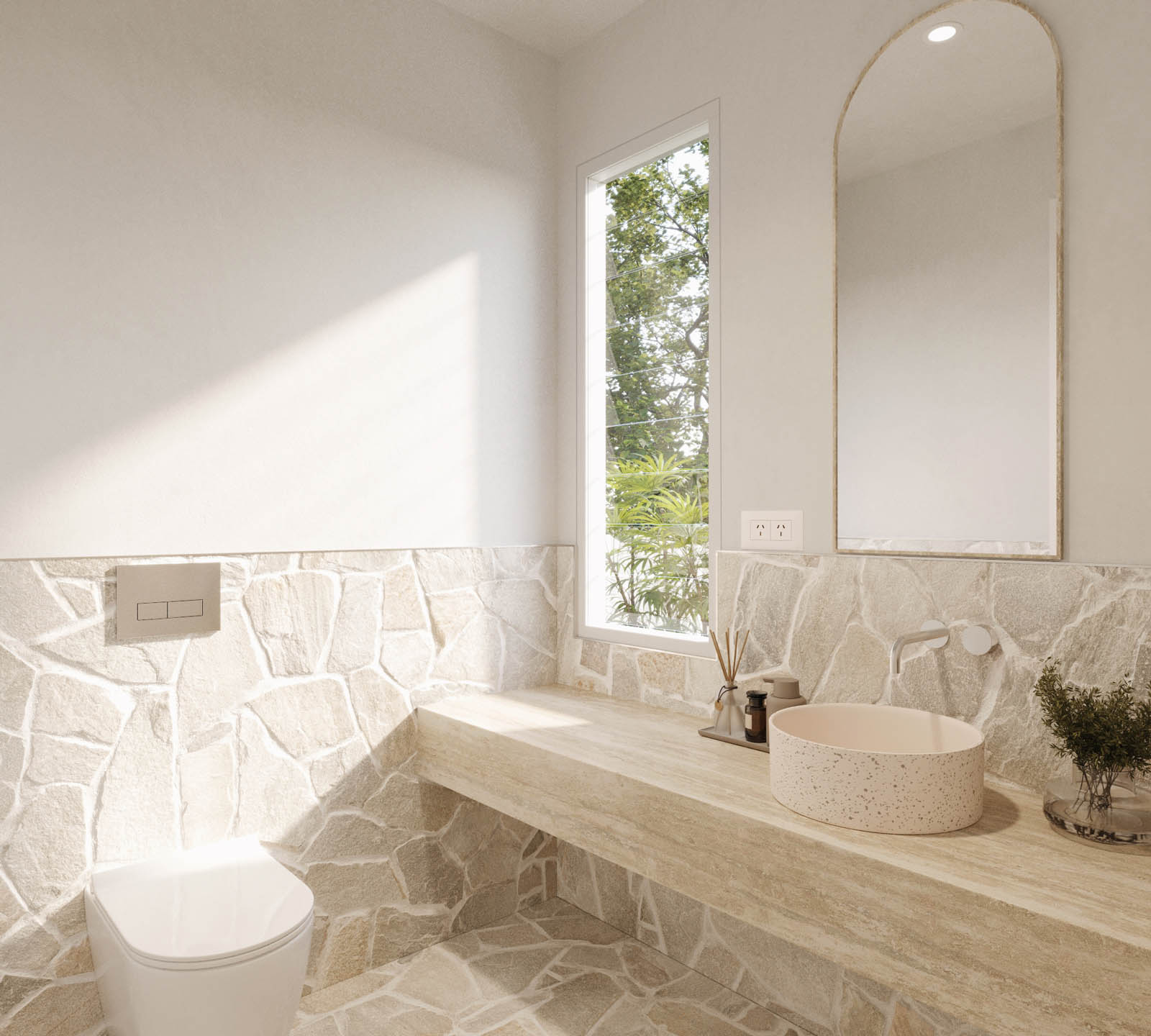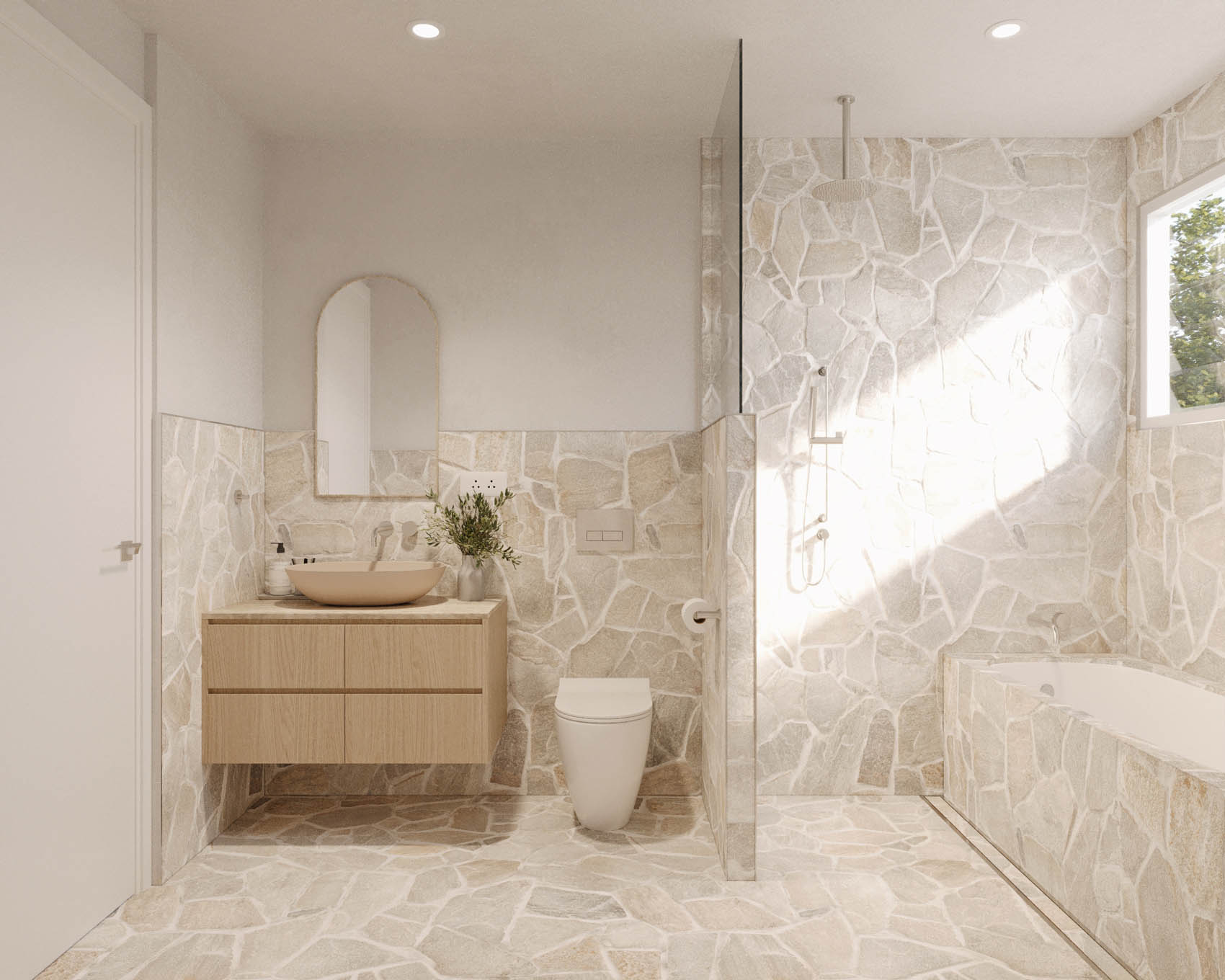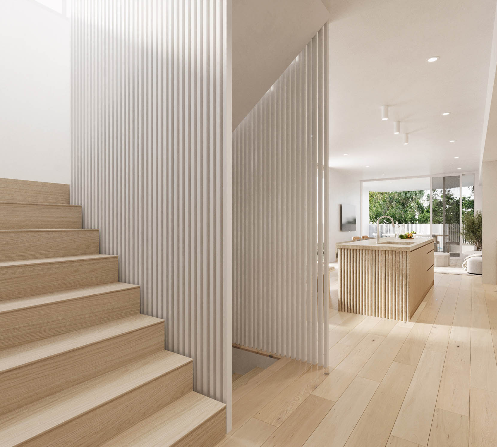 Inside, timeless finishes harmonise with soaring cathedral ceilings and curved feature walls. Each villa segregates social and sleeping quarters. The top floor houses four bedrooms and bathrooms, while downstairs, an open-plan kitchen, dining, and lounge area serves as the family's central hub.