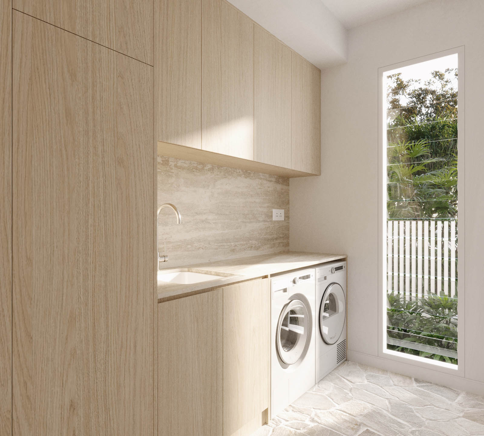 - The open-plan layout of the kitchen, living, and dining areas offers family-friendly functionality and a seamless connection to the outdoors.