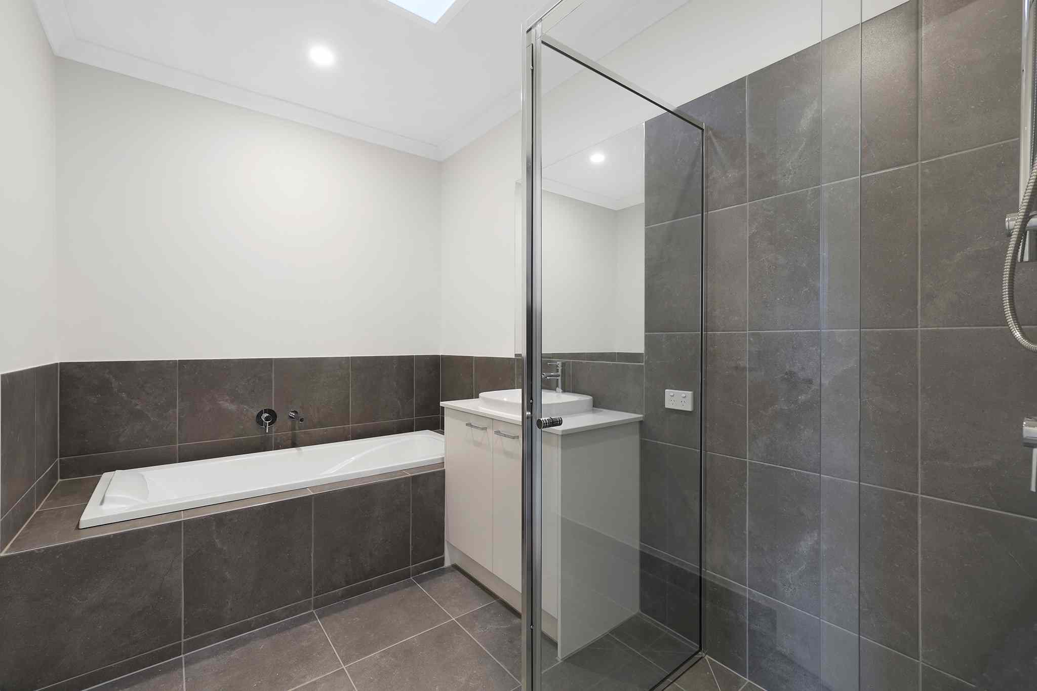 The grand master suite is situated at the front of the home and boasts a spacious dressing area with built-in robes, and a luxurious ensuite bathroom featuring double stone composite topped vanity and oversized shower with modern fixtures and fittings.