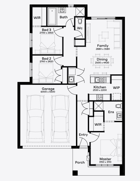 The Finch 16 offers a harmonious blend of style and functionality in its 3-bedroom, 2-bathroom design, complete with a 2-car garage. Ideal for a 10.5m+ block, this single-storey home captivates with its central living space, embodying the heart of family life. The master suite, a serene escape at the front, overlooks a lush garden, while two additional bedrooms ensure privacy. The sleek kitchen with a walk-in pantry flows into the dining and family areas, leading to the garden, perfect for seamless indoor-outdoor living. The Finch 16 cleverly incorporates a hidden laundry near the kitchen, maximising space and convenience for the perfect floor plan!