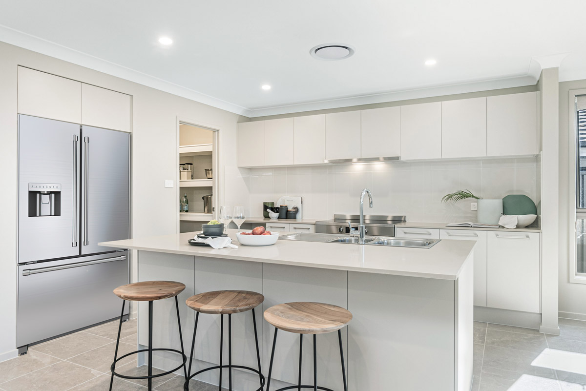 The ground floor of the Viceregal boasts an inviting open-plan layout, seamlessly combining a formal living area with an informal family/meals space. This design creates a spacious and welcoming environment for family gatherings, all set against the backdrop of elegant stone benchtops and stainless steel appliances in the kitchen. Large windows offer a view of the outdoor area, where you can unwind and keep an eye on the kids as they play.