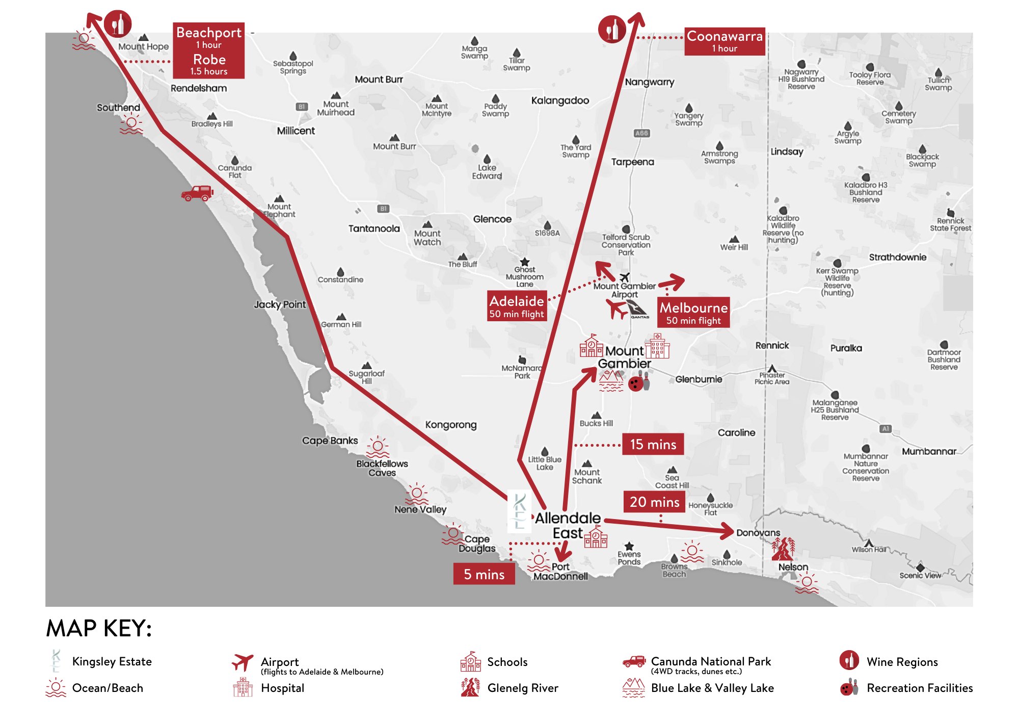 - Welcome to Kingsley Estate, located in the peaceful country township of Allendale East – 5 minutes from the beach and Port MacDonnell and a 15-minute drive to Mount Gambier