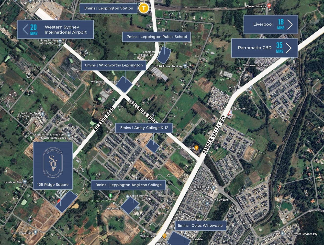 - Discover Leppington Square Estate, nestled in the vibrant and growing suburb of Leppington. Conveniently located within close proximity to Coles Willowdale, Leppington Village, Leppington Public School, Leppington Anglican College and Amity College K-12. Within minutes drive to Leppington train station. The forthcoming Western Sydney International Airport, set to open in 2026, is just a 20-minute drive, ensuring seamless connectivity.