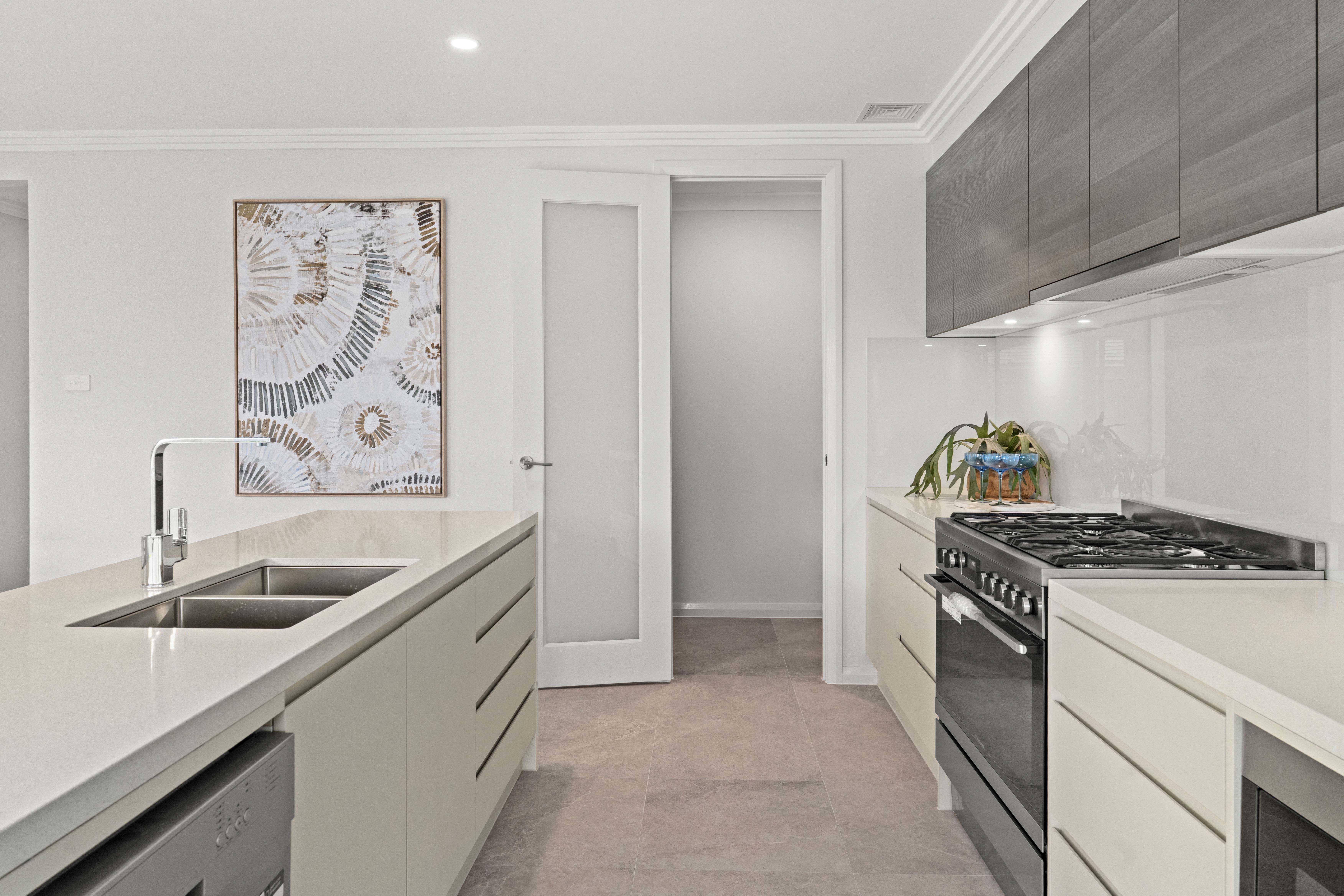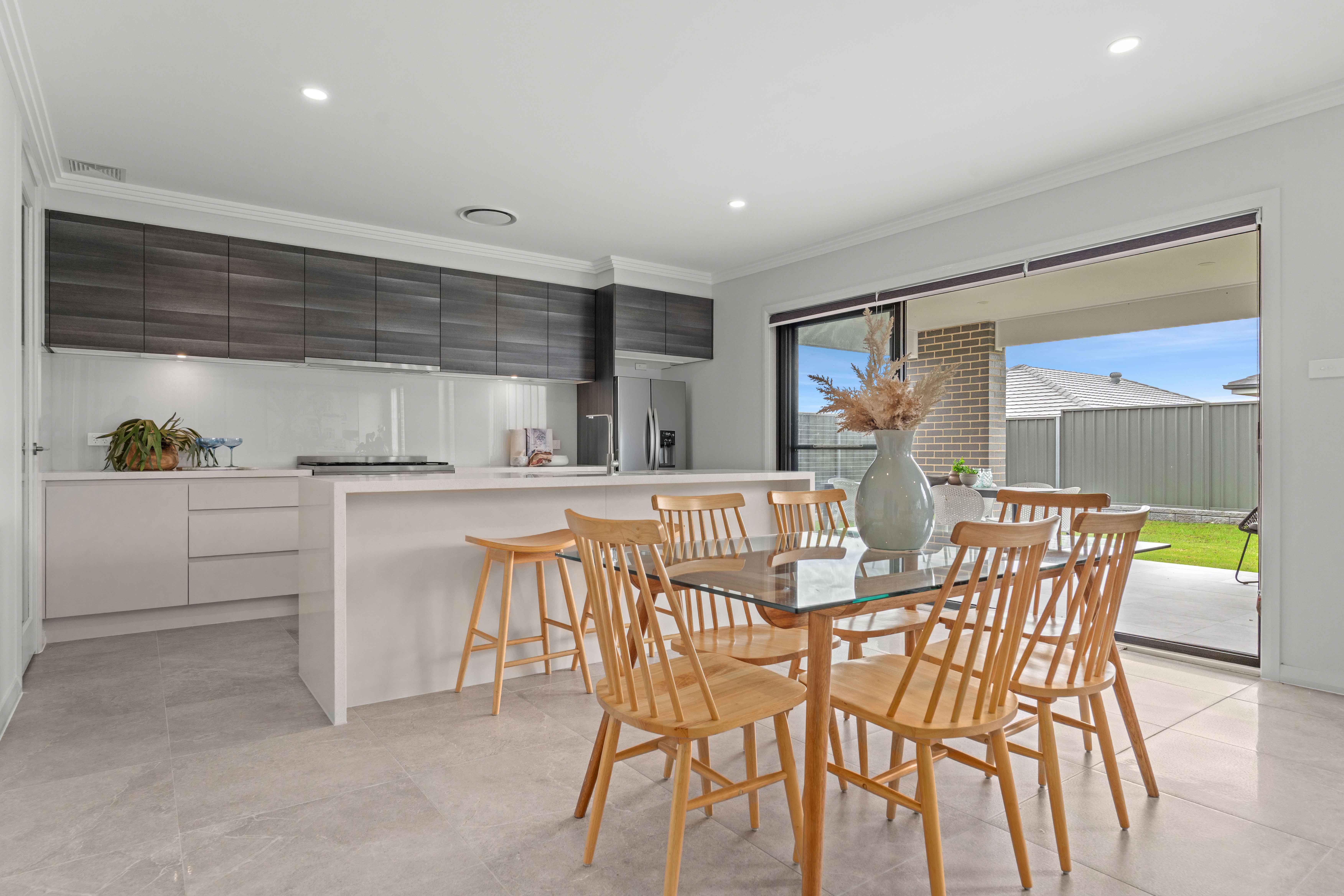 • Kitchen with 40mm stone bench tops with waterfall ends and stainless steel appliances, microwave included, soft-close drawers and glass splashback