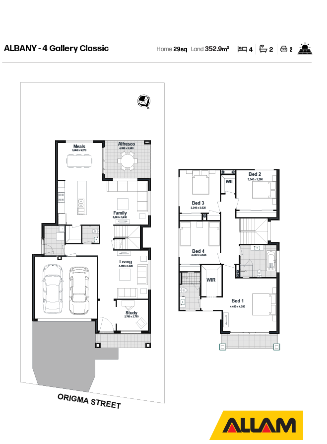 Disclaimer: Plans, drawings, and designs on this website are for marketing and illustrative purposes only. Dimensions are approximate, subject to survey and final subdivision plans (STCA). Plans are not to scale. Images, including artist impressions, may depict items not included in the sale. Purchasers should rely on their own enquiries and the Contract for Sale. Allam Homes Pty Limited may alter designs, specifications, dimensions, inclusions, and prices without notice. For full terms, visit www.allam.com.au.