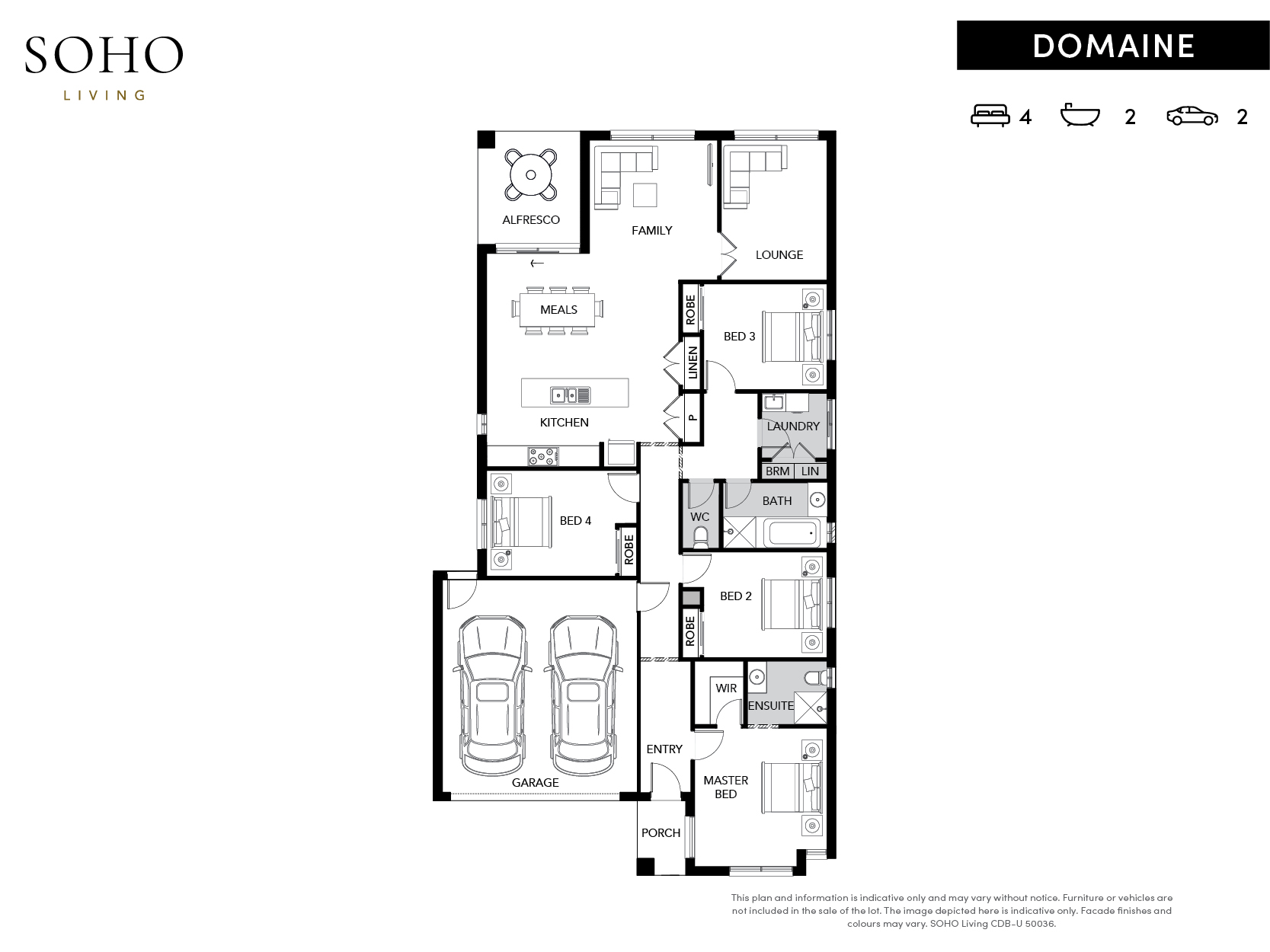 The Domaine is a perfect floorplan for growing families, providing abundant living space with a roomy lounge area and an open plan kitchen living dining area. With four bedrooms thoughtfully placed around the home, this design offers plenty of private retreats for family members to enjoy.