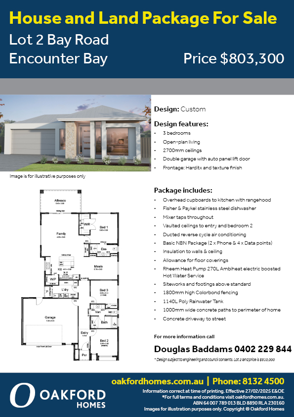 Located in Oakford Estate, Encounter Bay, this package is custom-designed to suit the land. The home offers three bedrooms, an open-plan living zone, and a double garage. This package offers the freedom to choose your own internal and external selections.