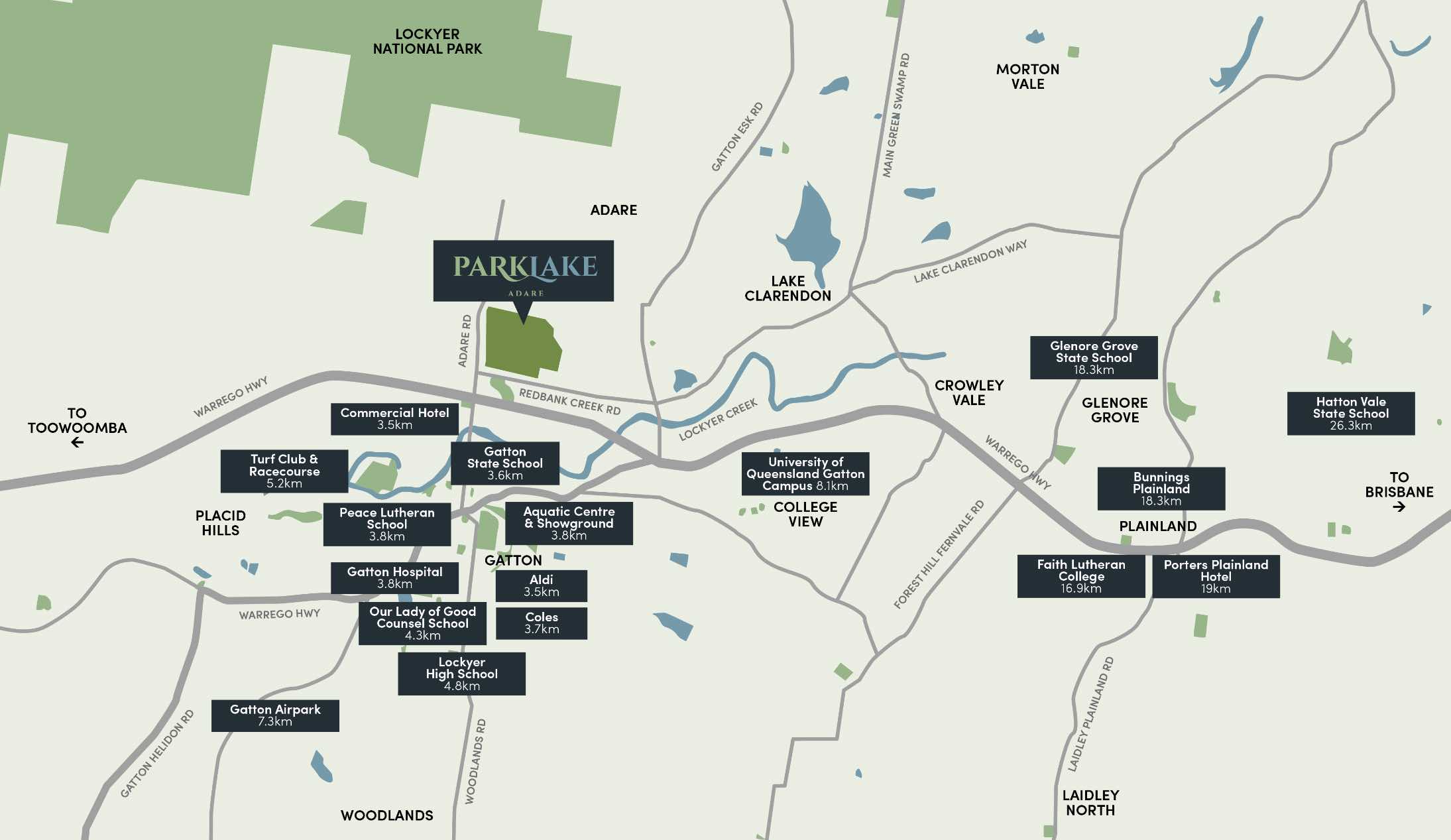 - Park Lake will be a highly sought-after family community with all of the residents’ homes nestled within an acreage lifestyle, whilst enjoying the quiet surrounds of the lake and bush trails. Residents’ community amenities will include undercover pavilions and picnic areas with walking and off-road bicycle tracks located within the parkland reserves.