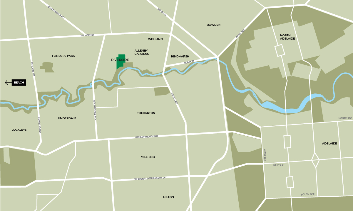 - Situated in leafy Allenby Gardens, three kilometres west of the city centre, Riverside is an exclusive, gated residential precinct where the ebb and flow of everyday life becomes a sensory adventure in minutes.